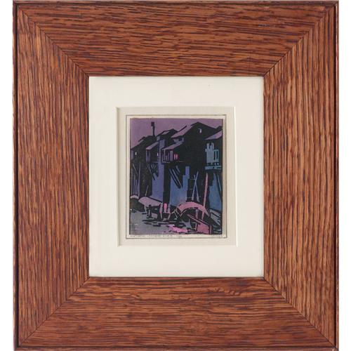 Herbert Waters color woodcut, edition of 50, signed and titled on mount, matted, framed in an oak Arts and Crafts frame, 3.75in.h x 3in.w