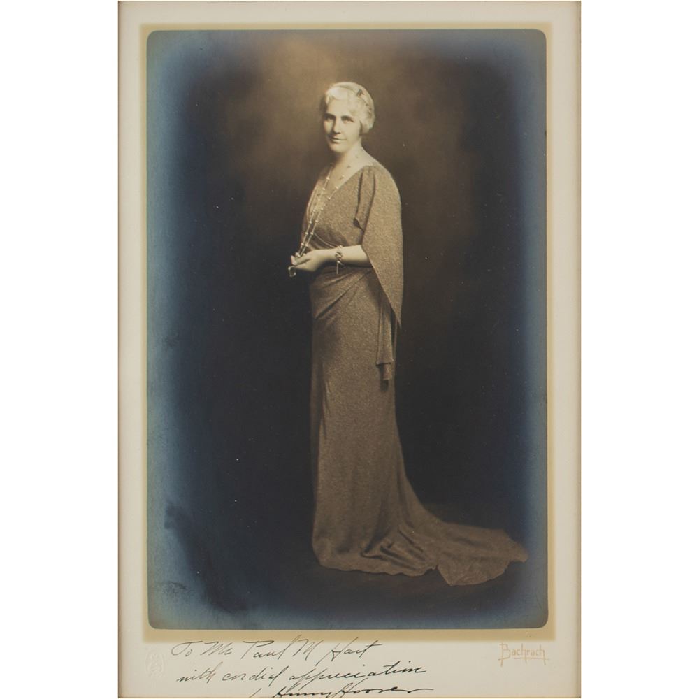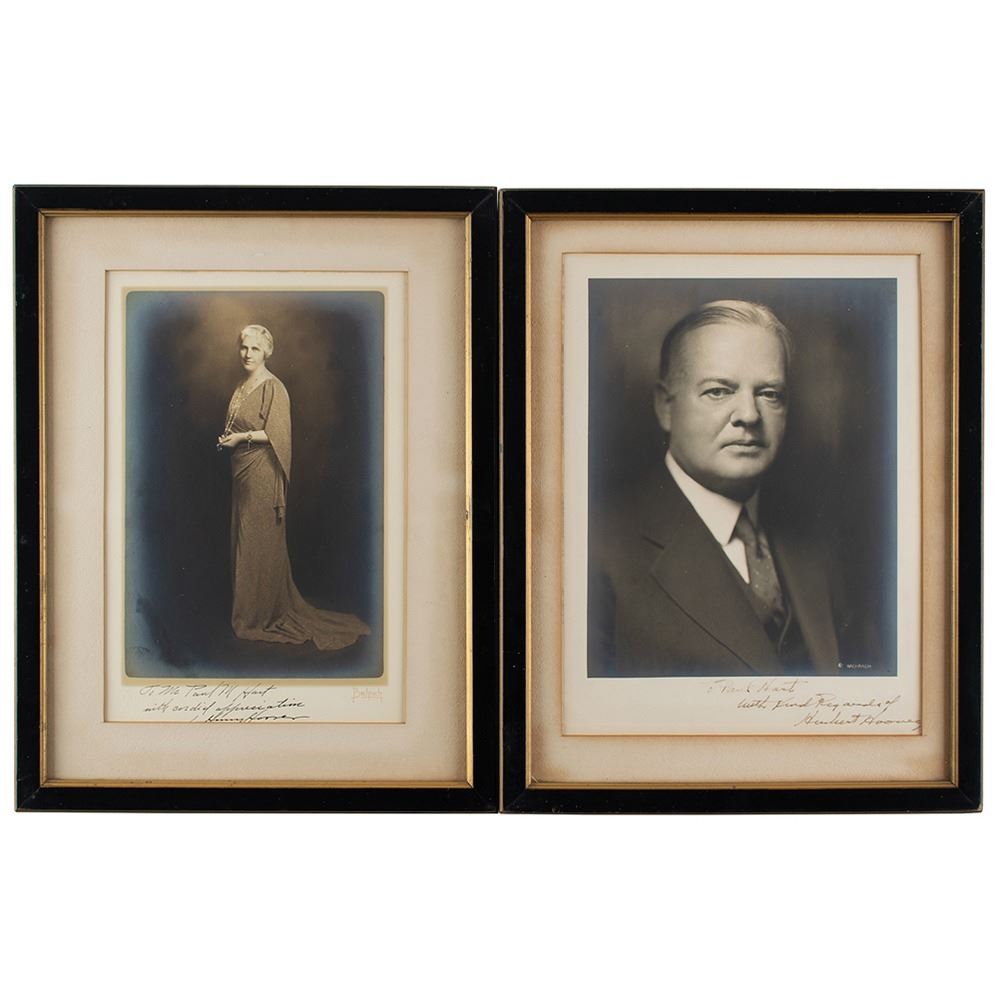 Desirable pairing of photographs inscribed to one of Hoover's Secret Service agents: a vintage matte-finish 8.5 x 11.25 Bachrach portrait of Hoover, signed and inscribed in the lower border in fountain pen, "To Paul Hart, With Kind Regards of Herbert Hoover"; and a vintage matte-finish 7 x 10.5 Bachrach portrait of his wife, signed and inscribed in the lower border in fountain pen, "To Mr. Paul M. Hart, with cordial appreciation, Lou Henry Hoover." Individually matted and framed to 11 x 14.5. In very good to fine condition, with light toning to the mats and silvering to the images, and the mat obscuring the beginning of Lou Henry's signature.