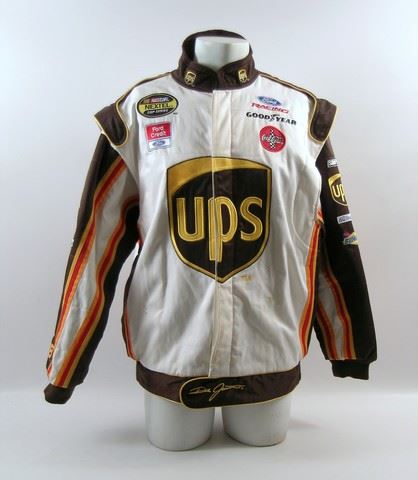 From "Herbie Fully Loaded" (2005) - one of the best in the Disney "Herbie-Love Bug" sequels - this is one of his screen worn racing jackets, instantly recognizable by the biggest sponsor: UPS. It is an official Chase Authentic Drivers Line Jacket, complete with not only UPS but all of Jarrett's sponsors patches. Has some dirt and stains from production use. (Size L).