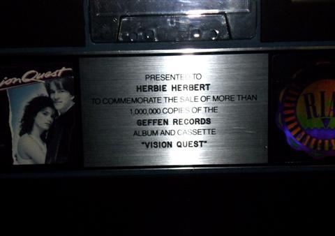 Herbie Hancock Platinum Record for Vision Quest - Presented to Herbie Hancock for 1 million sales of the Vision Quest Soundtrack. From the Dick Clark Auction of Rock and Roll. Framed in Plexiglas. 17" x 21". Oversized item. Additional shipping charges required.