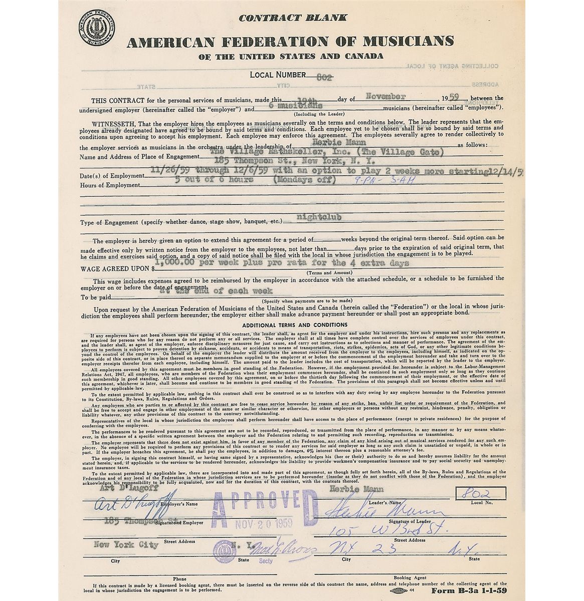 Jazz flutist and important early practitioner of world music (1930–2003). DS, one page, 8.5 x 11, November 19, 1959. Standard American Federation of Musicians contract for Mann to appear at The Village Gate, New York, from November 11–December 6, 1959, in exchange for $1000 per week. Signed at the conclusion in blue ballpoint by Mann, adding his address below, and countersigned by the club’s owner, famous jazz impresario Art D’Lugoff. In fine condition.