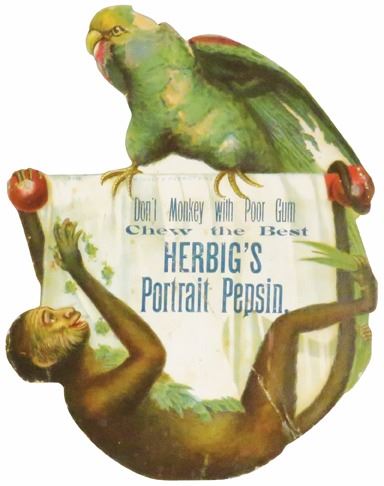 Herbig's Portrait Pepsin Die Cut Cardboard Sign. Parrot and Monkey. Crease in center and edgewear. 7 1/2 X 9 3/4 inches.