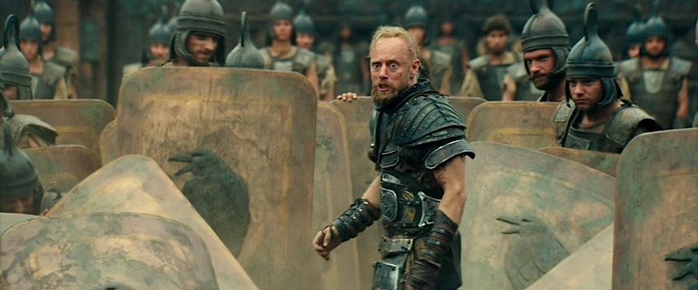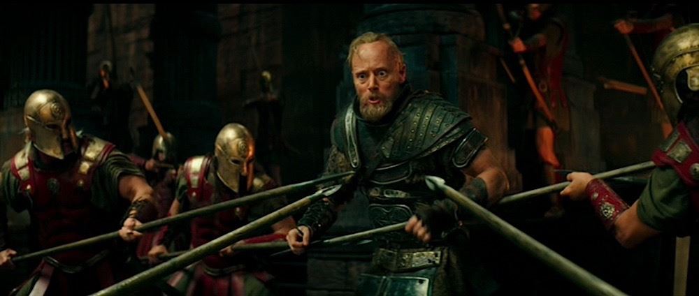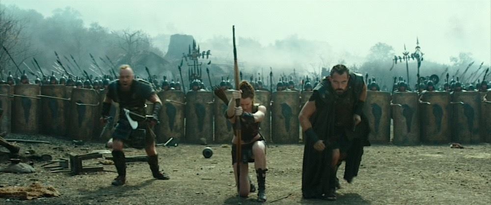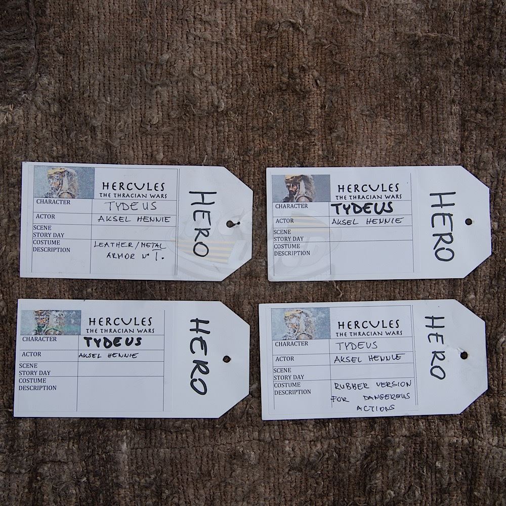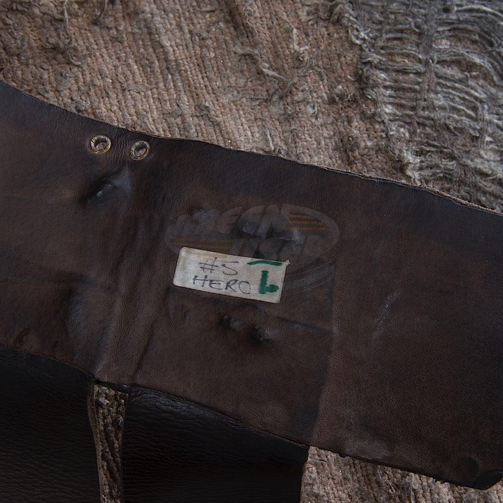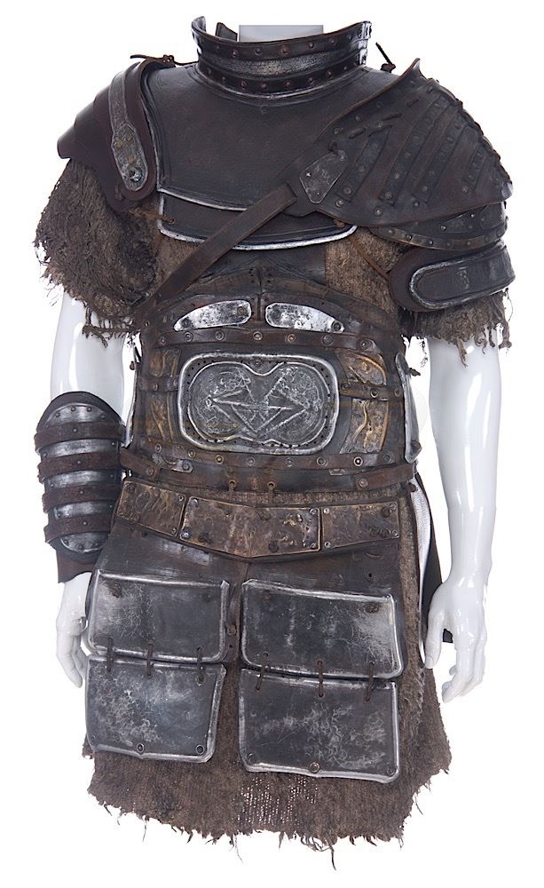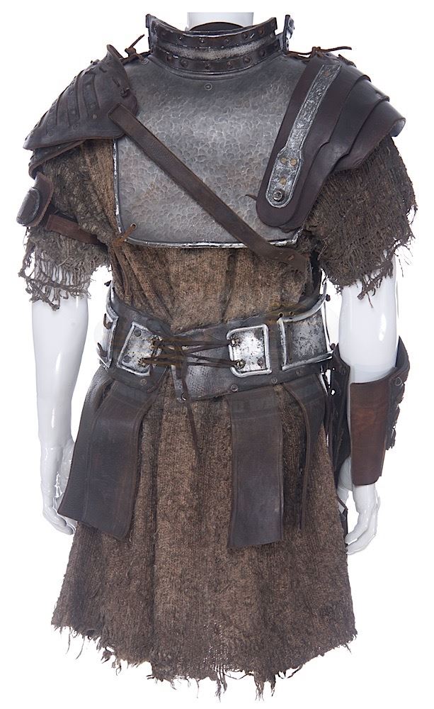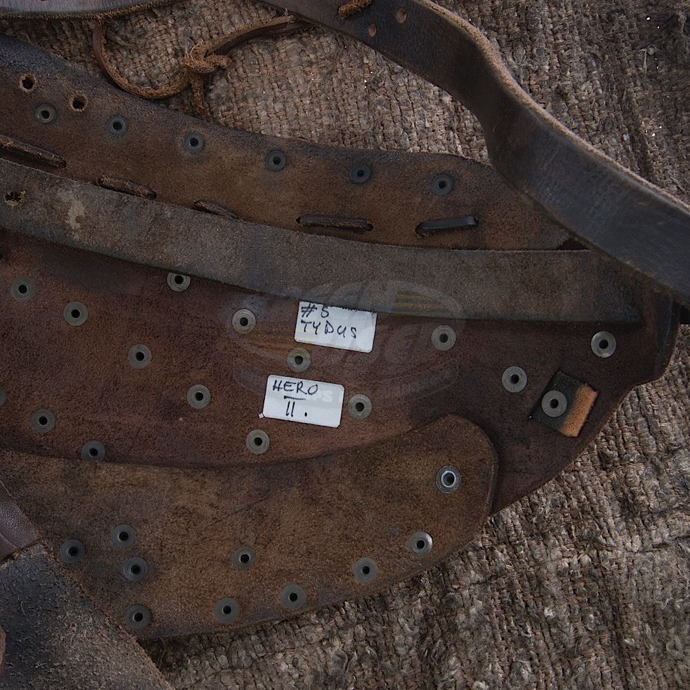 (Paramount Pictures, 2014) This combat armor was custom-made by the production for use by Aksel Hennie as "Tydeus". The armor consists of a plastic and leather shoulder armor, rubber shoulder plate, cotton subligaria, wool tunic, leather and metal belt and a leather and rubber vambrace. The pieces are marked "Hero" by production, wear from use is present.