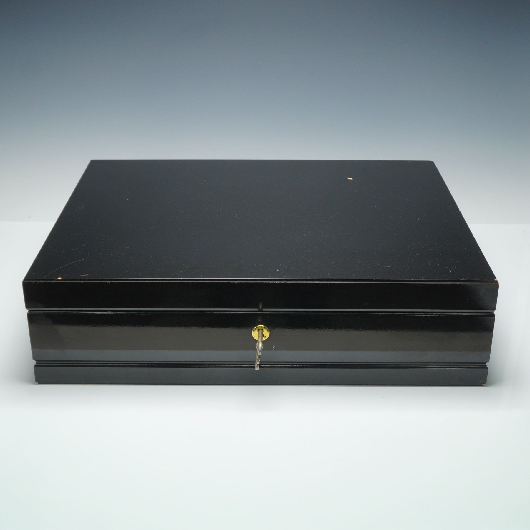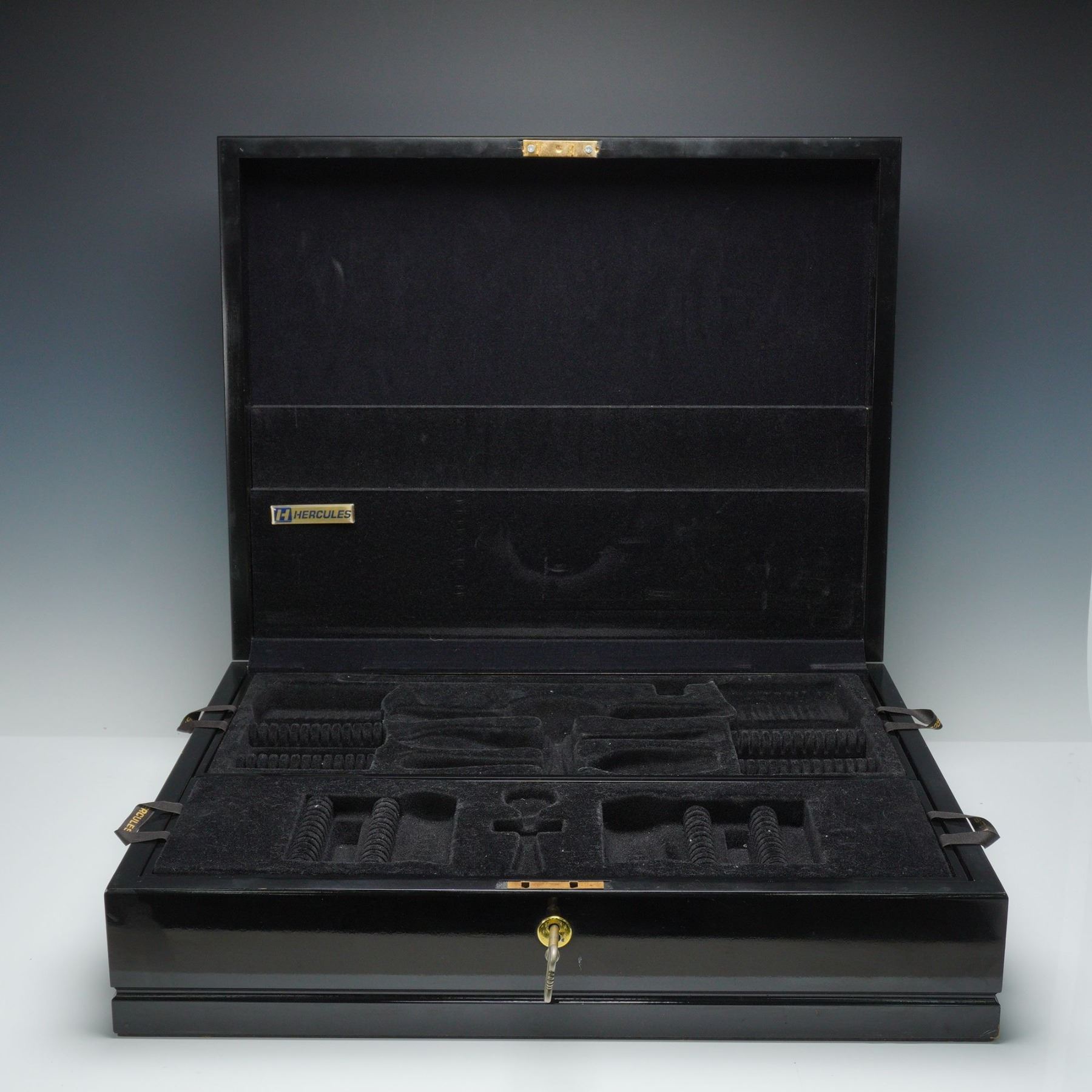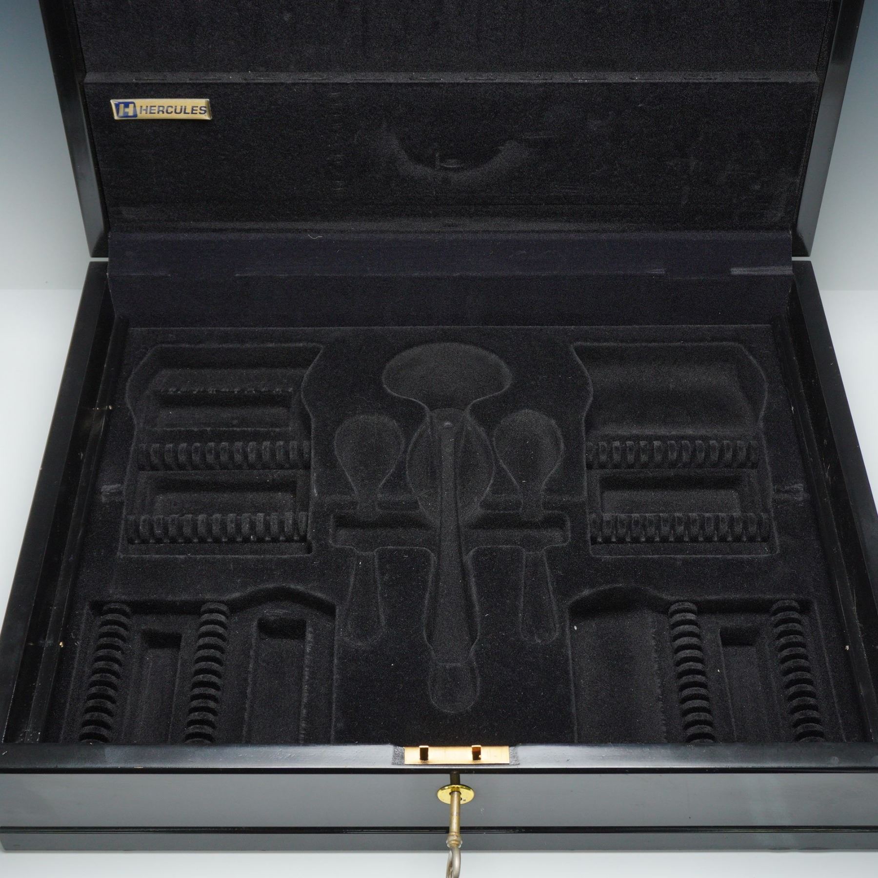 Elegant mid-century Hercules flatware chest crafted in glossy black lacquered wood with gold-tone hardware and original key. The interior features a rich black velvet lining with removable trays, designed to accommodate a complete silver flatware service for twelve. The interior retains the Hercules label, a mark of quality presentation cases from the era. This case displays minor wear consistent with age, including light surface scuffs and small corner nicks, enhancing its vintage character. A refined and functional storage piece for collectors or for restoring a complete flatware set.