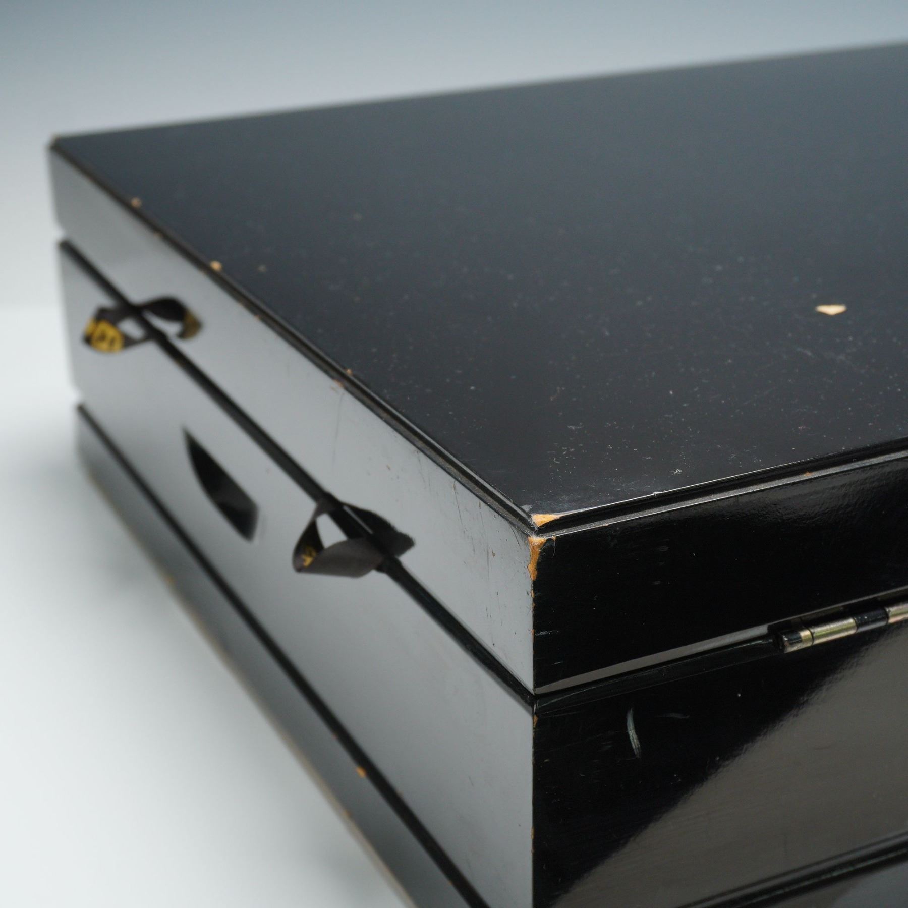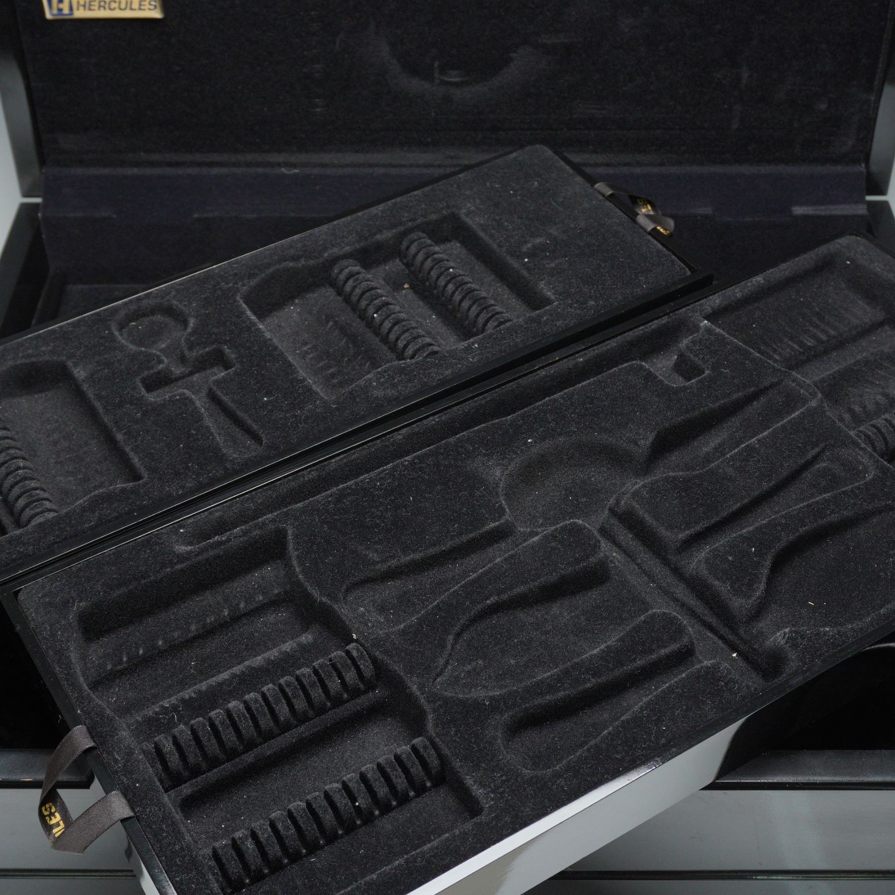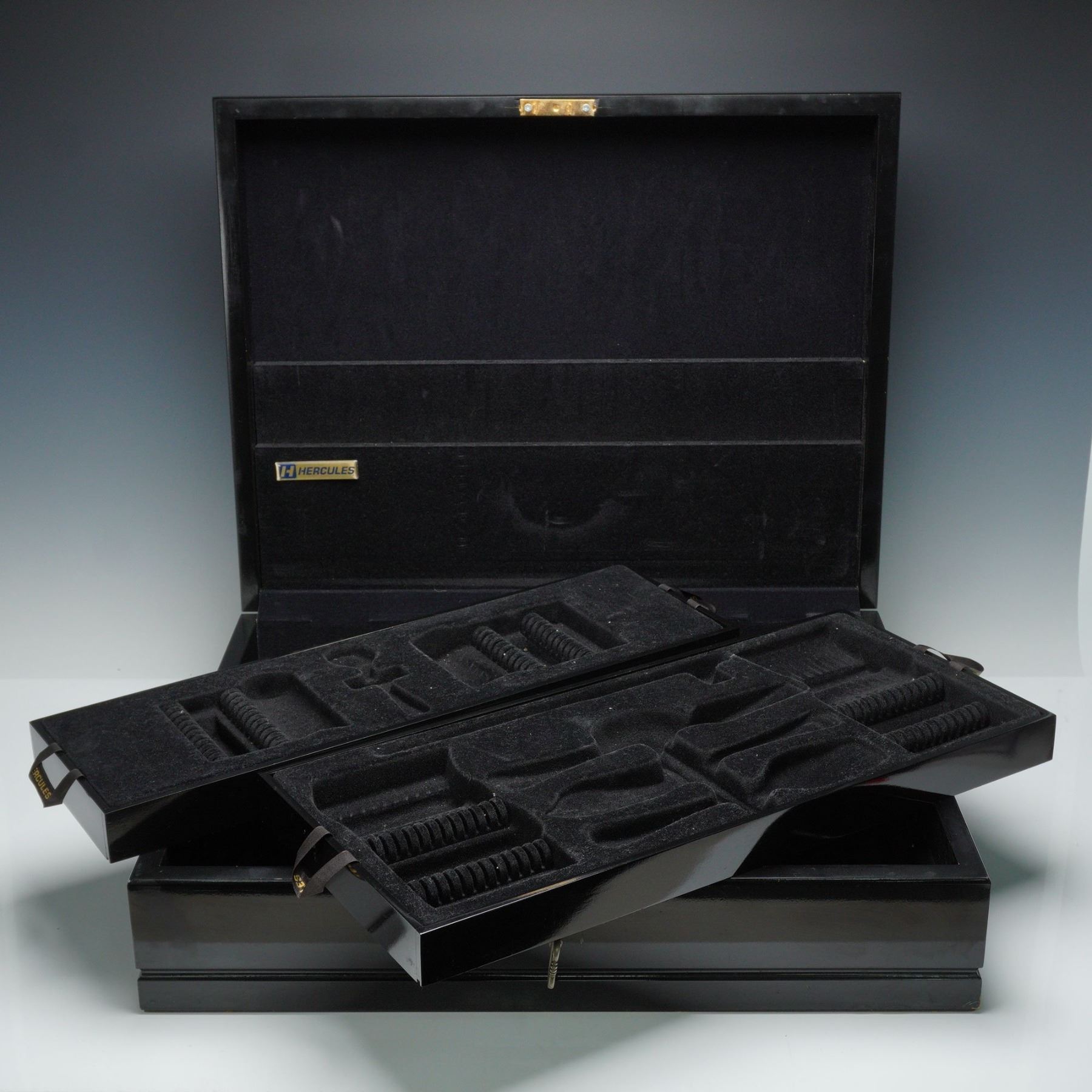 Elegant mid-century Hercules flatware chest crafted in glossy black lacquered wood with gold-tone hardware and original key. The interior features a rich black velvet lining with removable trays, designed to accommodate a complete silver flatware service for twelve. The interior retains the Hercules label, a mark of quality presentation cases from the era. This case displays minor wear consistent with age, including light surface scuffs and small corner nicks, enhancing its vintage character. A refined and functional storage piece for collectors or for restoring a complete flatware set.