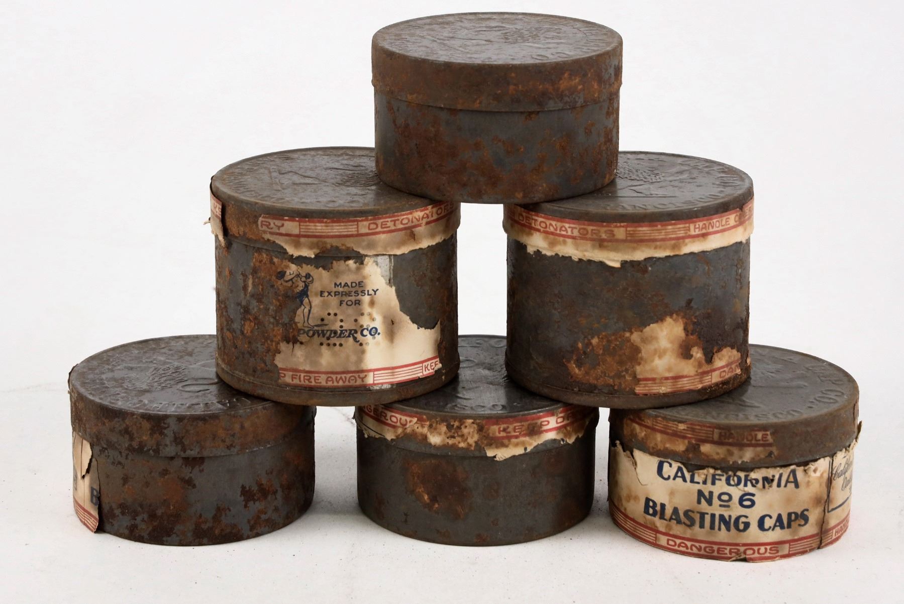 Hercules Blasting Cap tins, #6 (4), #8 (2). These tins have a highly polished lid (by fh, years ago), some with paper remnants. The #6 is the standard, shorter cap tin. Found in the underground powder magazine at the Mary-Drinkwater Mine in the 1970s, between Silver Peak and Tonopah.