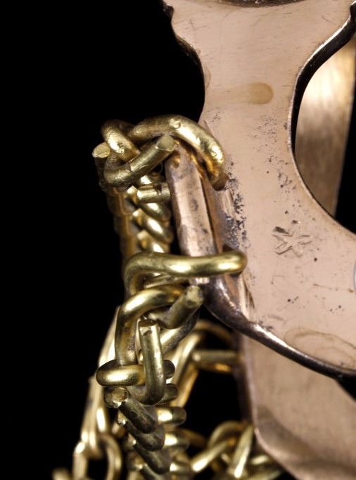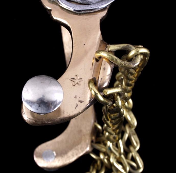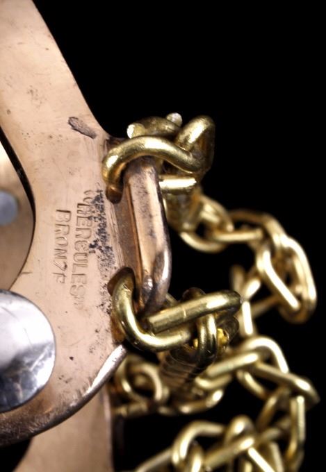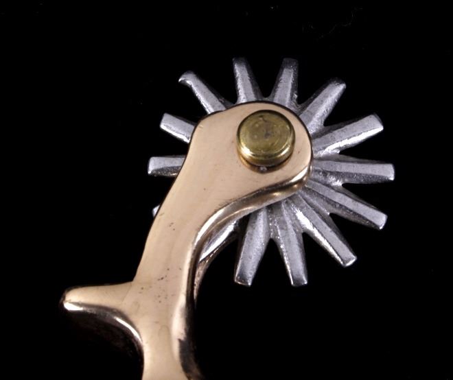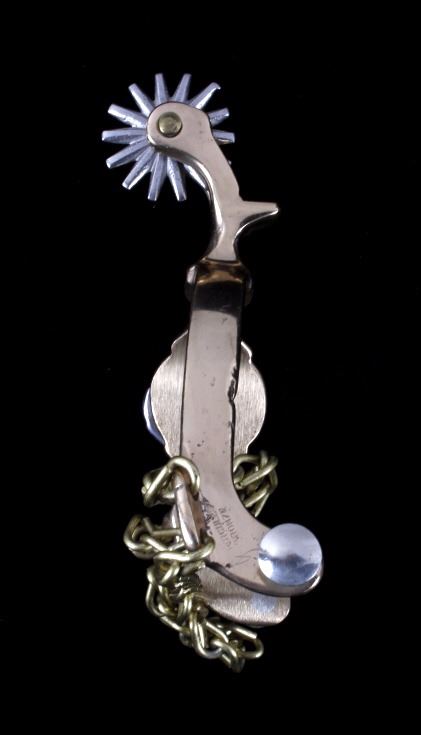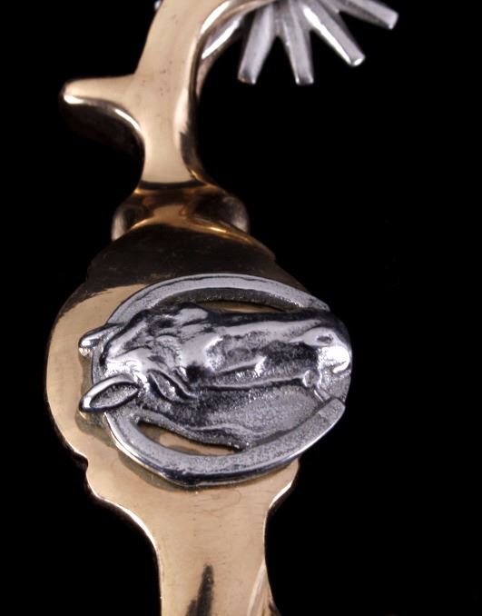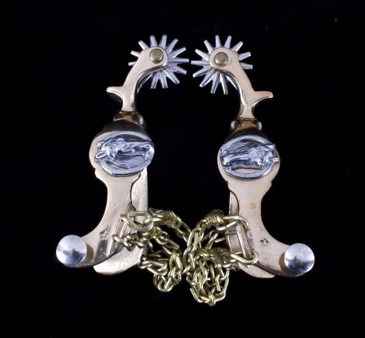 This is an excellent set of original August Buermann and North & Judd "Hercules" Bronze spurs. The spurs show a silver mounted horse head in a horse show overlay. The spurs date to post-1926 after the August Buermann Co. was purchased by North & Judd (the spurs show the anchor and star hallmark along with being marked, "'Hercules' Bronze". These are in fine condition showing the original bright finish and spur strap chains. Each spur measures 3.75"x5.25"x1 5/8".