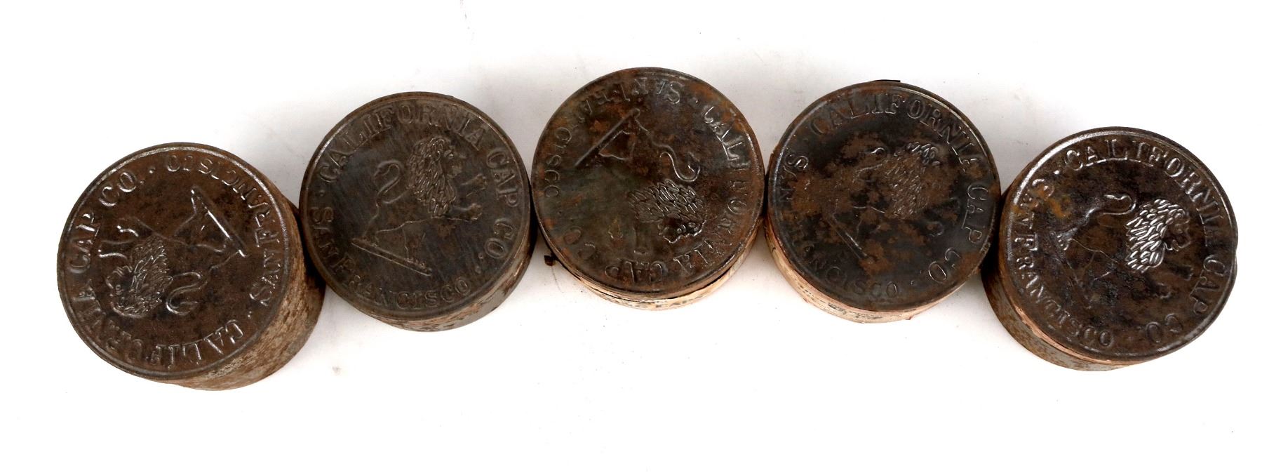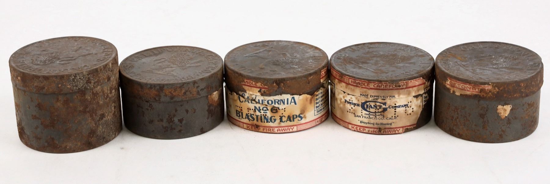 Hercules Blasting Cap tins, #6 (4), #8 (1). These tins have a highly polished lid (by fh, years ago), some with paper remnants. The #6 is the standard, shorter cap tin. Found in the underground powder magazine at the Mary-Drinkwater Mine in the 1970s, between Silver Peak and Tonopah.