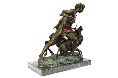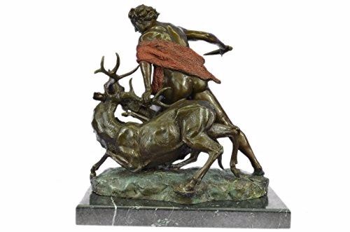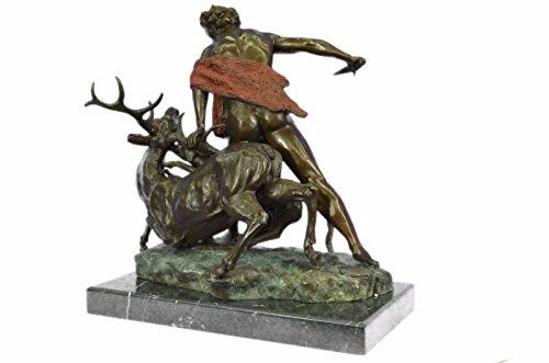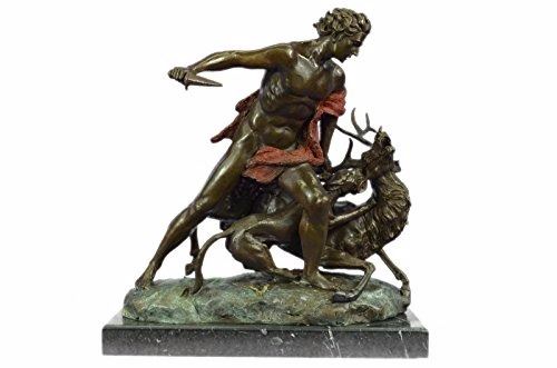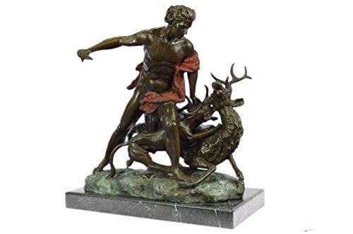 In Greek mythology, the Ceryneian Hind Greek: also called Cerynitis, was an enormous hind (deer), who lived in Keryneia, Greece. It was sacred to Artemis, the chaste goddess of the hunt, animals and unmarried women. It had golden antlers like a stag and hooves of bronze or brass, and it was said that it could outrun an arrow in flight. The capture of the hind was one of the labors of Heracles. He is mounted upon a black marble base. Bronze Dimensions with Marble Base: Height 18 X Width 17 inches. Weight: 48 LBS.