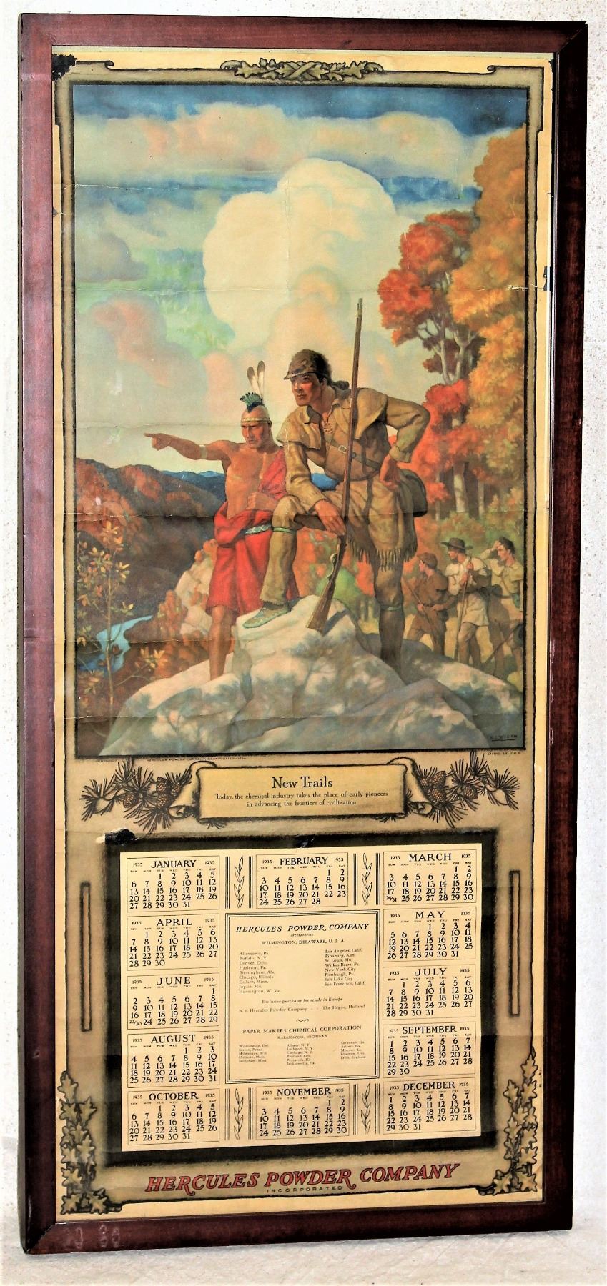 Attractive Wyeth image of mountain man and Indian scout, on 1935 calendar, advertising Hercules Powder Co. In vintage frame with calendar measuring 13"x 30".