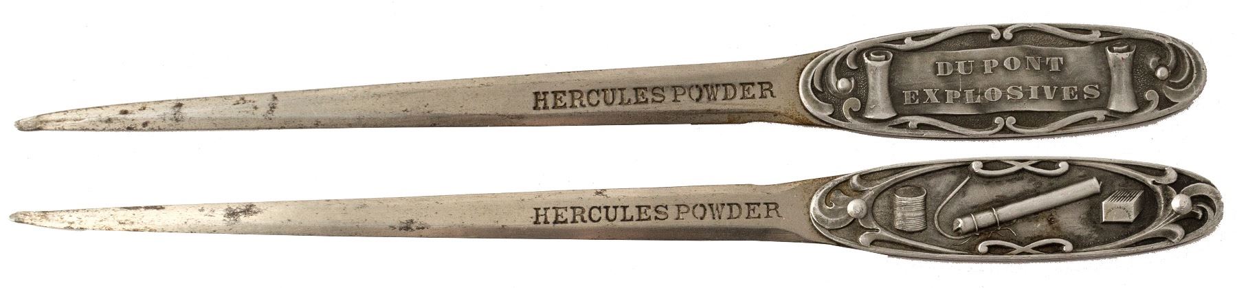 Original Hercules Powder Co letter opener, possibly silver plated brass. "Du Pont Explosives" on die struck handle, "Hercules Powder" gang punched on opener blade on both sides. 9" long. Very Rare! State: City: HWAC#: 49500 Date: