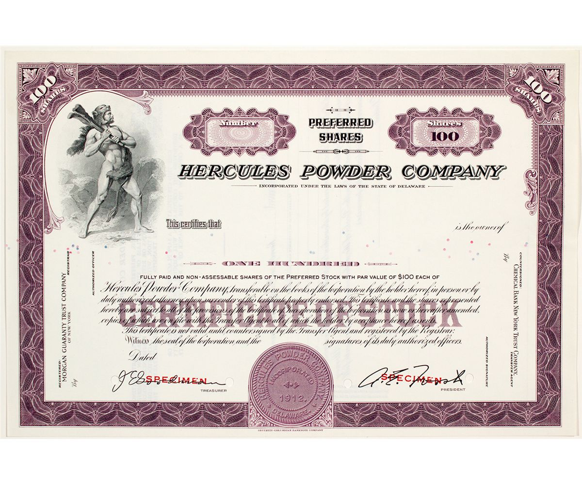 This is an unissued stock certificate from the Hercules Powder Company. The piece is in very fine condition. Rare. - HKA#65698