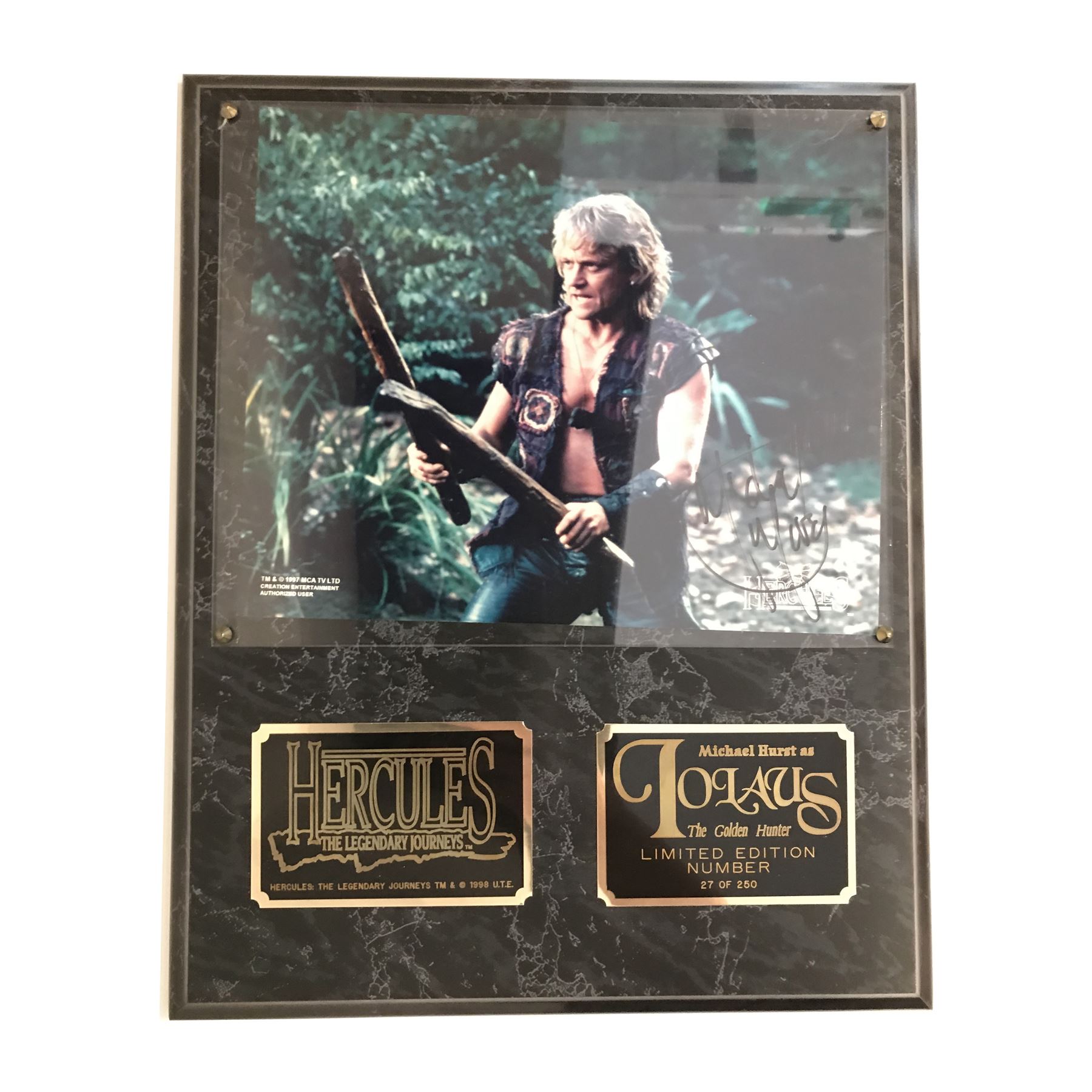 Hercules: The Legendary Journeys Framed autograph of Michael Hurst as Lolaus, The Golden Hunter. Limited Edition number 27 of 250. All items come direct from the collection of the western chairman of Xena Warrior Princess' official fan club. Framed on a plaque (15"x12") 1997.