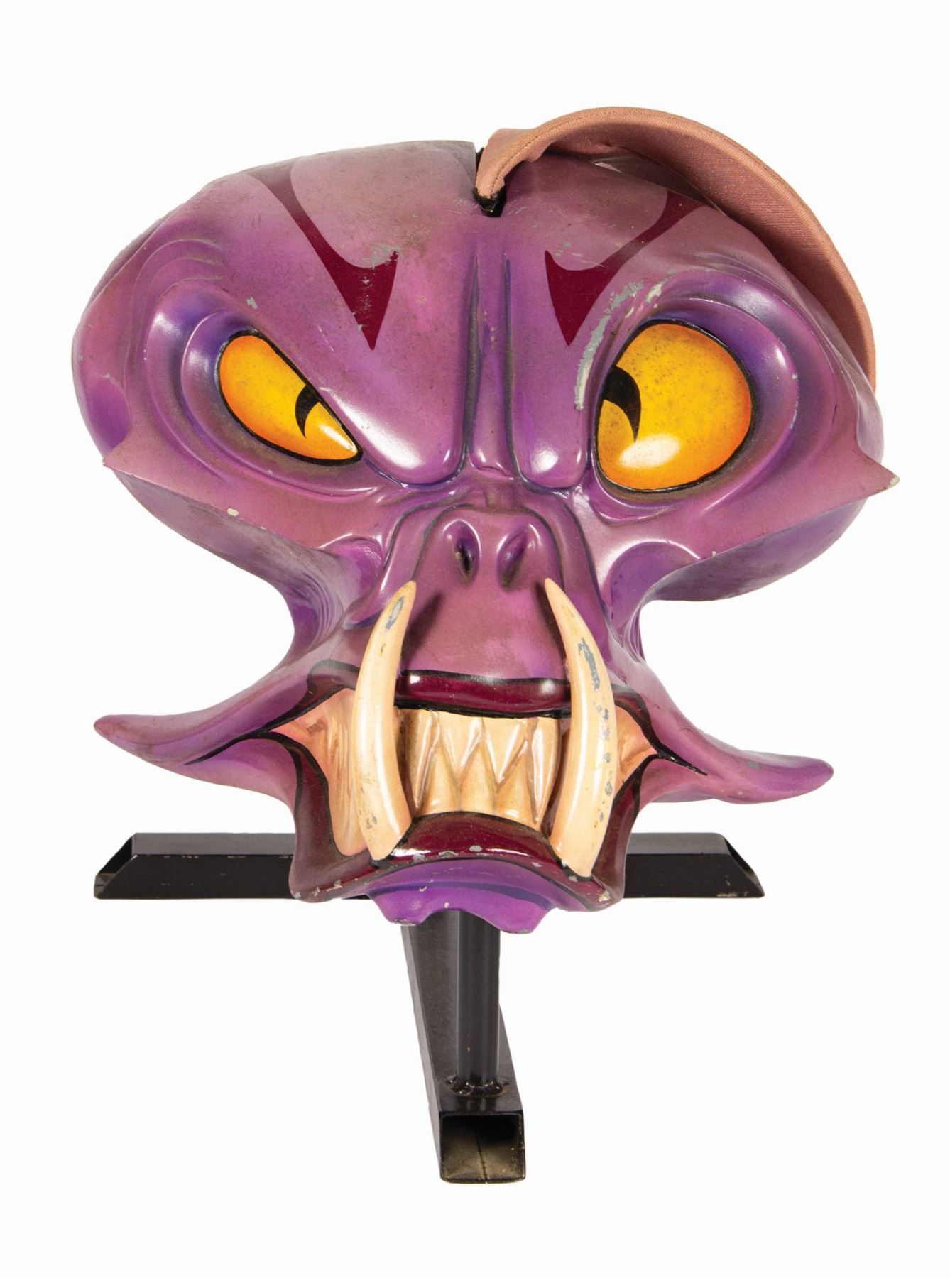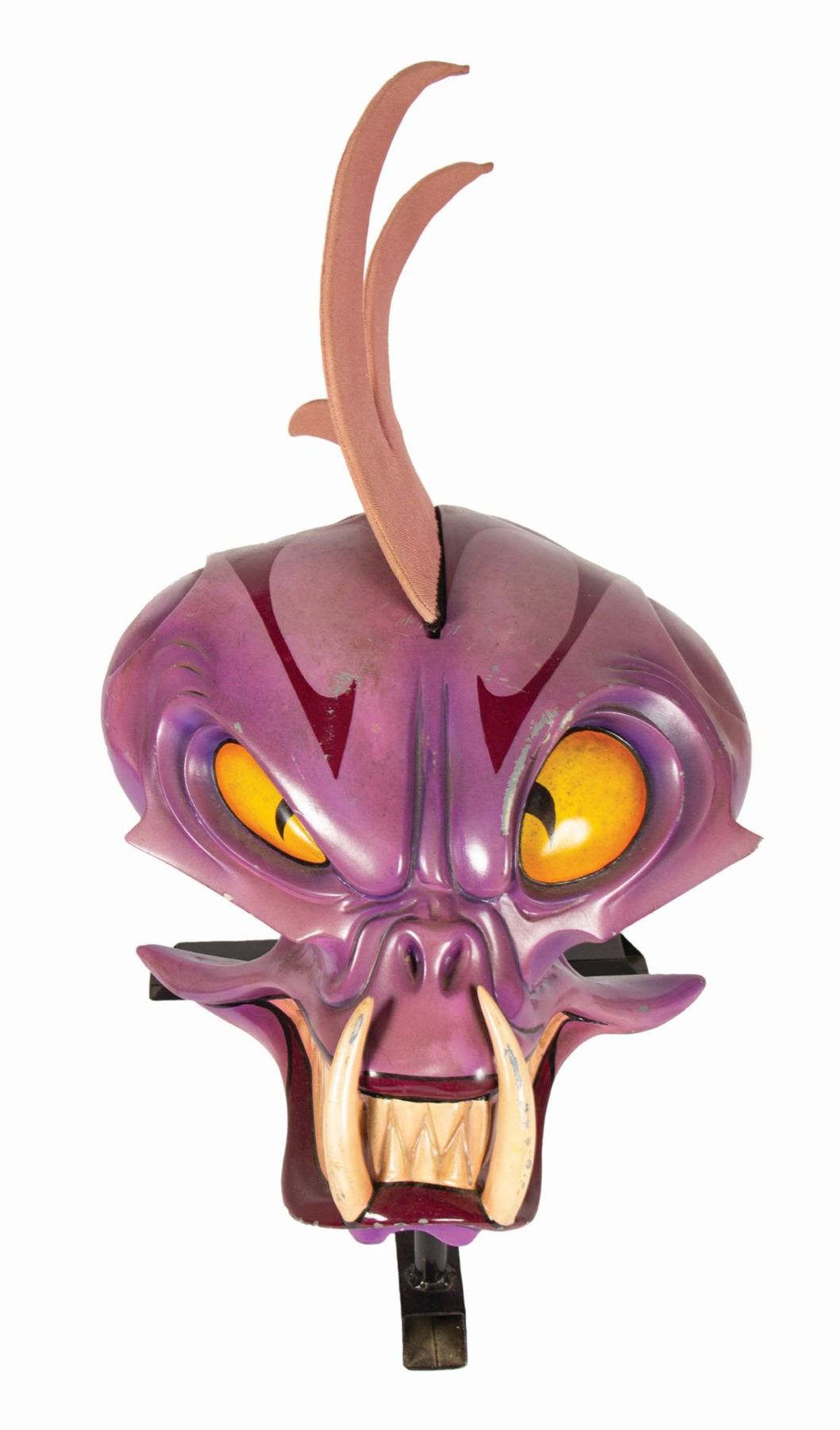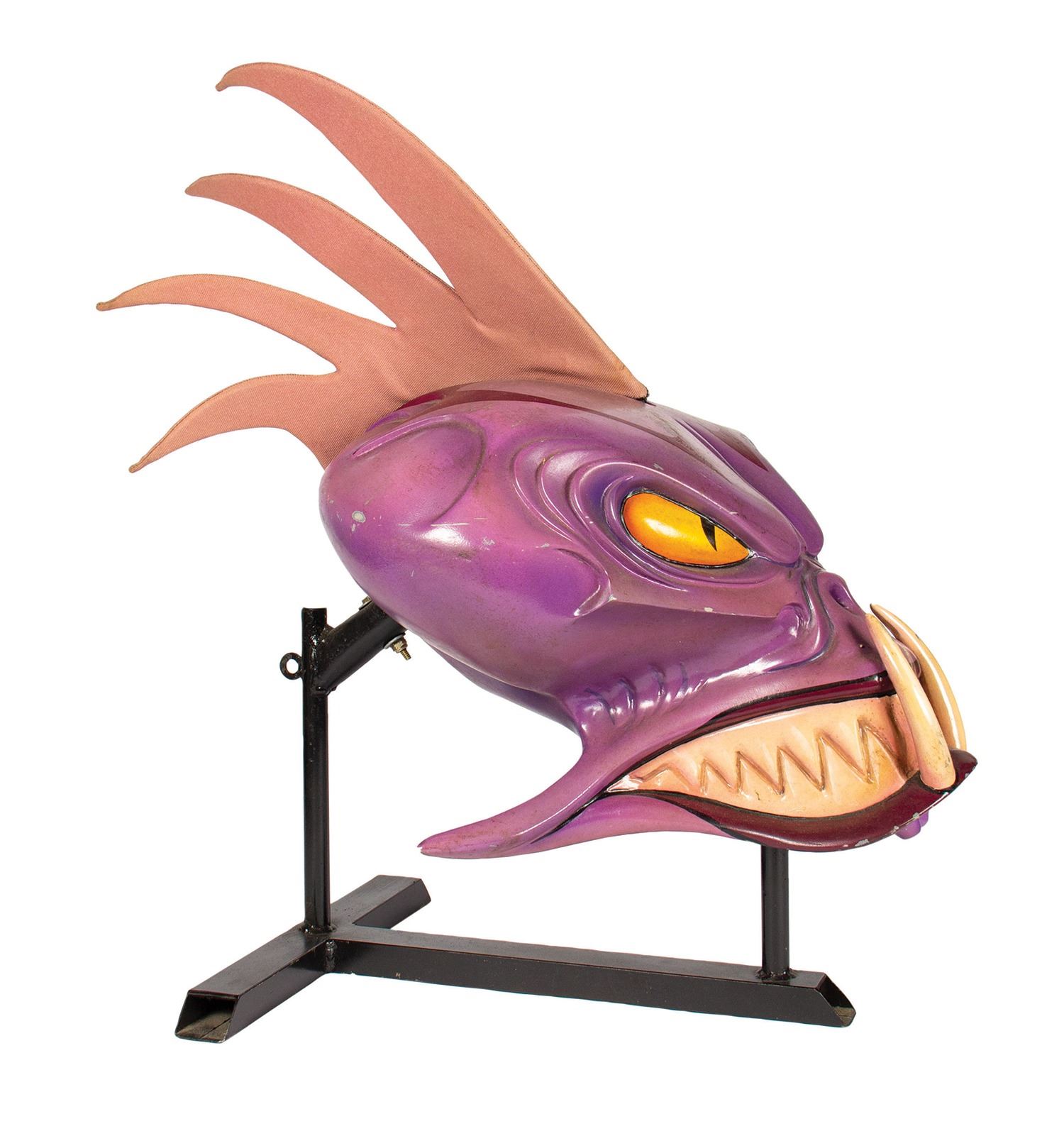 (Disney-MGM, c.1997) A large test head for the mythological Hydra that is believed to have been created during the development of the Hercules Victory Parade. Versions of this parade ran at Disneyland, Disney-MGM Studios, Tokyo Disneyland, and Disneyland Paris to promote the release of the animated film. This test head is attributed to the MGM-Studios version of the parade which included both walk-around characters and a large parade float of the monstrous Hydra. Composed of hand-painted fiberglass on a metal support, the head measures approximately 17" tall, 13" wide, and 23" deep. The condition is good overall, with a few chips and scratches to the paint throughout.