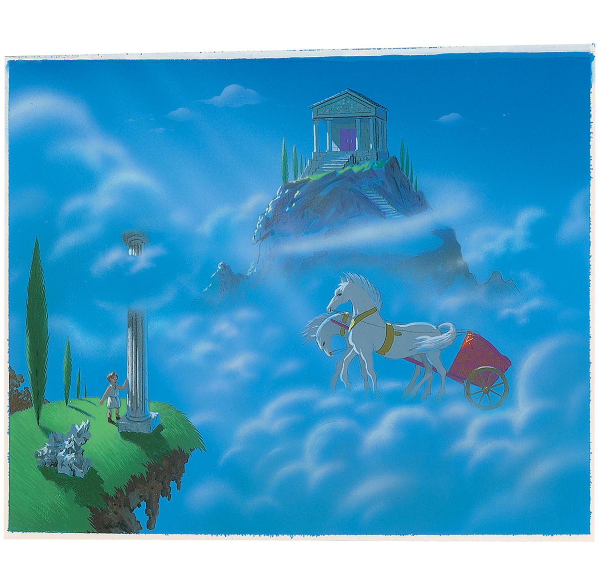 (Walt Disney Studios, 1997) Vivid original concept art from Hercules, showing the title character next to a column, a chariot, and a Greek temple high in the clouds. Accomplished in watercolor, gouache, and airbrush on a 10.5 x 8.75 sheet of artist’s cardstock. In fine condition.