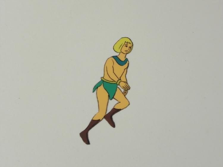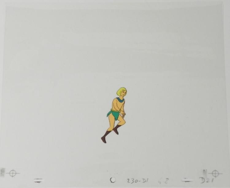 The Herculoids battled to defend their planet from menaces on * Amzot/Quasar and from outer space. All of the Herculoids displayed * Human-level intelligence - employing precision teamwork and complex * tactics - as well as emotions, and Zandor and Tara both * displayed a working knowledge of complex alien technologies as well as * the ability to pilot interstellar spacecraft—but essentially, Zandor, * Tara, Dorno, and the Herculoids were fighting to keep Amzot/Quasar a * technology-free, primitive planet. This is further * indicated by the pseudo-barbarian outfits of Zandor, Tara, and Dorno * and the fact that technology was used mainly by the various villains, * but rarely if ever by the heroes. Although the "speech" of their * companions was limited and repetitive, Zandor, Tara * and Dorno demonstrated that Gloop and Gleep, at least, had a * comprehensive mode of communication, and that they could at least * understand and interpret this language. * * * * **The cel is at least 35 years old. * * I don't know what that thing is, but I'm getting the heck outta here... * * Original Animation CelSize of * cel: 10 1/2" x 12 1/2"Excellent * condition * This is * an original hand-painted cel set-up * used in the production of an episode of "Herculoids." Each one-of-a-kind * set-up represents a slight change in position of the characters. When * individually photographed and projected in rapid succession, * the images * appear to move. To create production cels, the original animator's * drawing is * transferred onto an acetate cel (by hand-inking and/or photo copying). * The cel is then hand-painted on the reverse side. * * The cel is ready to be matted and * framed. The notations are located at the bottom of * the cel. * *