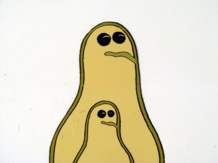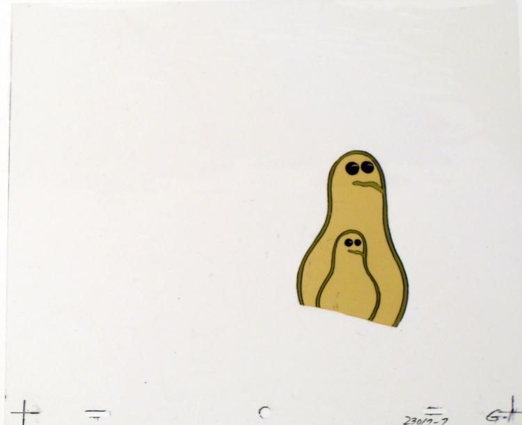 The Herculoids battled to defend their planet from menaces on * Amzot/Quasar and from outer space. All of the Herculoids displayed * Human-level intelligence - employing precision teamwork and complex * tactics - as well as emotions, and Zandor and Tara both * displayed a working knowledge of complex alien technologies as well as * the ability to pilot interstellar spacecraft—but essentially, Zandor, * Tara, Dorno, and the Herculoids were fighting to keep Amzot/Quasar a * technology-free, primitive planet. This is further * indicated by the pseudo-barbarian outfits of Zandor, Tara, and Dorno * and the fact that technology was used mainly by the various villains, * but rarely if ever by the heroes. Although the "speech" of their * companions was limited and repetitive, Zandor, Tara * and Dorno demonstrated that Gloop and Gleep, at least, had a * comprehensive mode of communication, and that they could at least * understand and interpret this language. * * * * **The cel is at least 35 years old. * * * Don't worry Gleep, I will protect you... * * <ul type="disc"> * Original Animation * Cel * * Overall * Size of the Cel: 10 1/2" x 12 1/2" * Very good condition; some paint residue on Gloop and Gleep * This is an original hand-painted cel set-up * used in the production of an episode of "Herculoids." Each one-of-a-kind * set-up represents a slight change in position of the characters. When * individually photographed and projected in rapid succession, * the images * appear to move. * * To create production cels, the original animator's drawing is * transferred onto an acetate cel (by hand-inking and/or photo copying). * The cel is then hand-painted on the reverse side. * * The cel is ready to be matted and * framed. The notations are located at the bottom of * the cel. * *