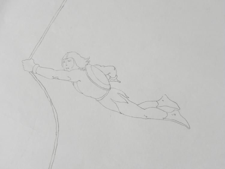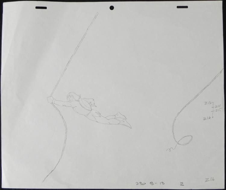 The Herculoids battled to defend their planet from menaces on Amzot/Quasar and from outer space. All of the Herculoids displayed Human-level intelligence - employing precision teamwork and complex tactics - as well as emotions, and Zandor and Tara both displayed a working knowledge of complex alien technologies as well as the ability to pilot interstellar spacecraft-but essentially, Zandor, Tara, Dorno, and the Herculoids were fighting to keep Amzot/Quasar a technology-free, primitive planet. This is further indicated by the pseudo-barbarian outfits of Zandor, Tara, and Dorno and the fact that technology was used mainly by the various villains, but rarely if ever by the heroes. Although the "speech" of their companions was limited and repetitive, Zandor, Tara and Dorno demonstrated that Gloop and Gleep, at least, had a comprehensive mode of communication, and that they could at least understand and interpret this language. **The drawing is at least 35 years old.Who needs Superman when you have the all mighty ZANDOR!!!Original "rough" animation drawing in black pencil with the notations in blackSize of drawing: 10 1/2" x 12 1/2"Very good; some minor creasing to the edges that can be matted outTraditional animation is a multi-step process which includes various types of art techniques. Drawings are a key part of the process, in which the animator creates the design and movement of the characters. Drawings are then transferred onto acetate cels (by hand-inking and/or photo copying) to create a production cel, which is then hand painted on the back side, using paint colors chosen and approved by the creator of the series. The drawing is ready to be matted and framed. The notations are located at the top and middle of the drawing