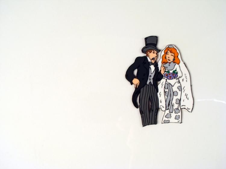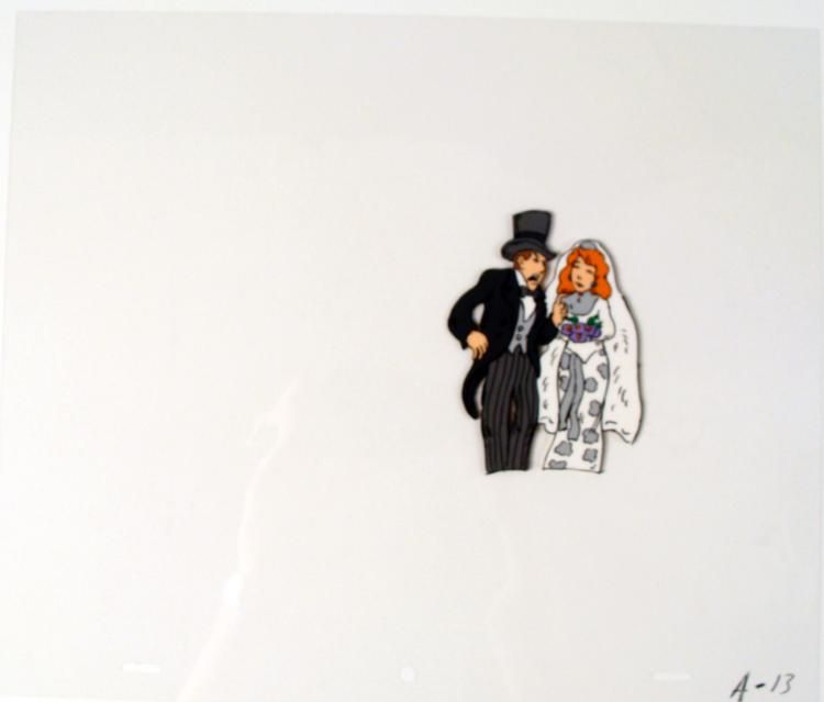 This is an original animation cel of a bride and groom. * * * * Groom: You really know how to tick me off... Bride: It's not my fault you have no filter and were saying those nasty things to me... * * * Medium: Hand painted acetate cel * * Cel size: 10 1/2" x 12 1/2" * * Notations: Bottom of cel * * Condition: Excellent