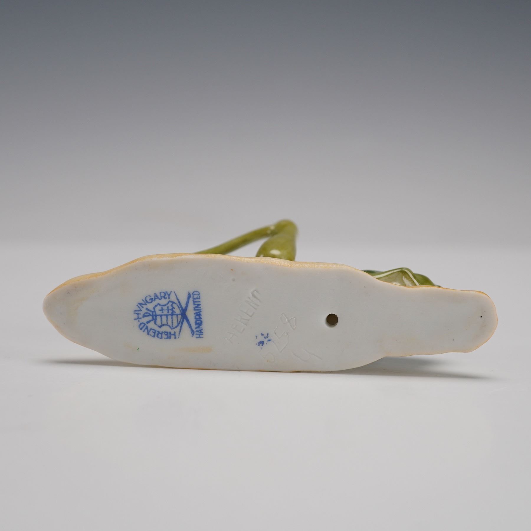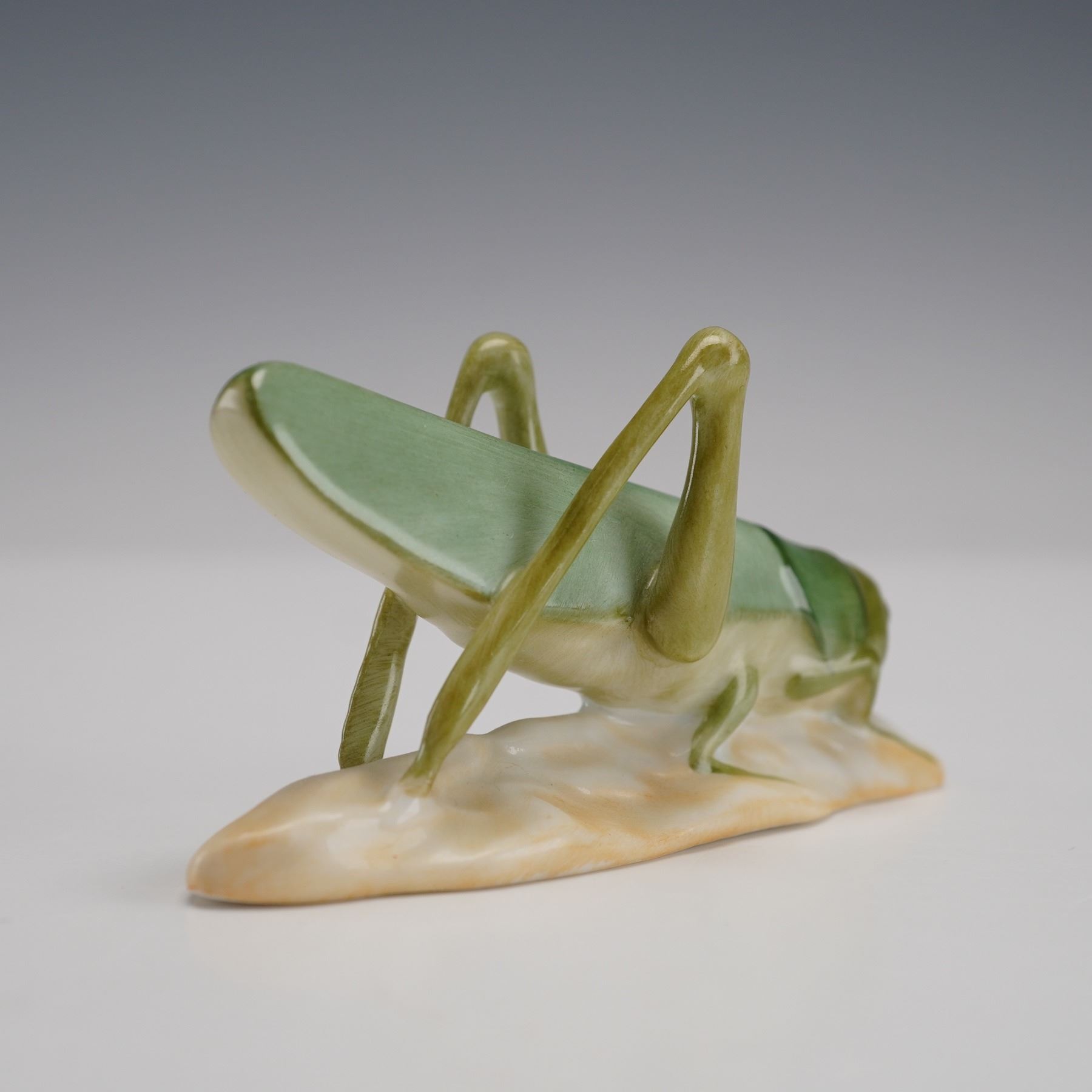 A fine hand-painted porcelain grasshopper figurine by Herend of Hungary, delicately modeled and finished in shades of green and cream with a naturalistic gloss glaze. The piece captures the lively posture and intricate form of the insect as it rests upon a soft, earth-toned porcelain base. The underside bears the blue Herend Hungary backstamp, denoting hand-painted craftsmanship, along with impressed model numbers and artist markings. This charming example reflects Herend's celebrated attention to detail and lifelike artistry in porcelain.