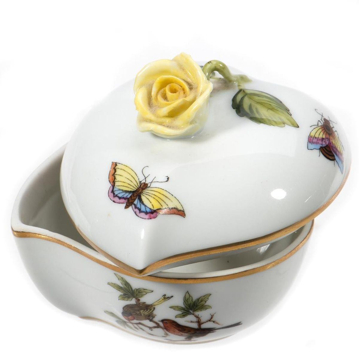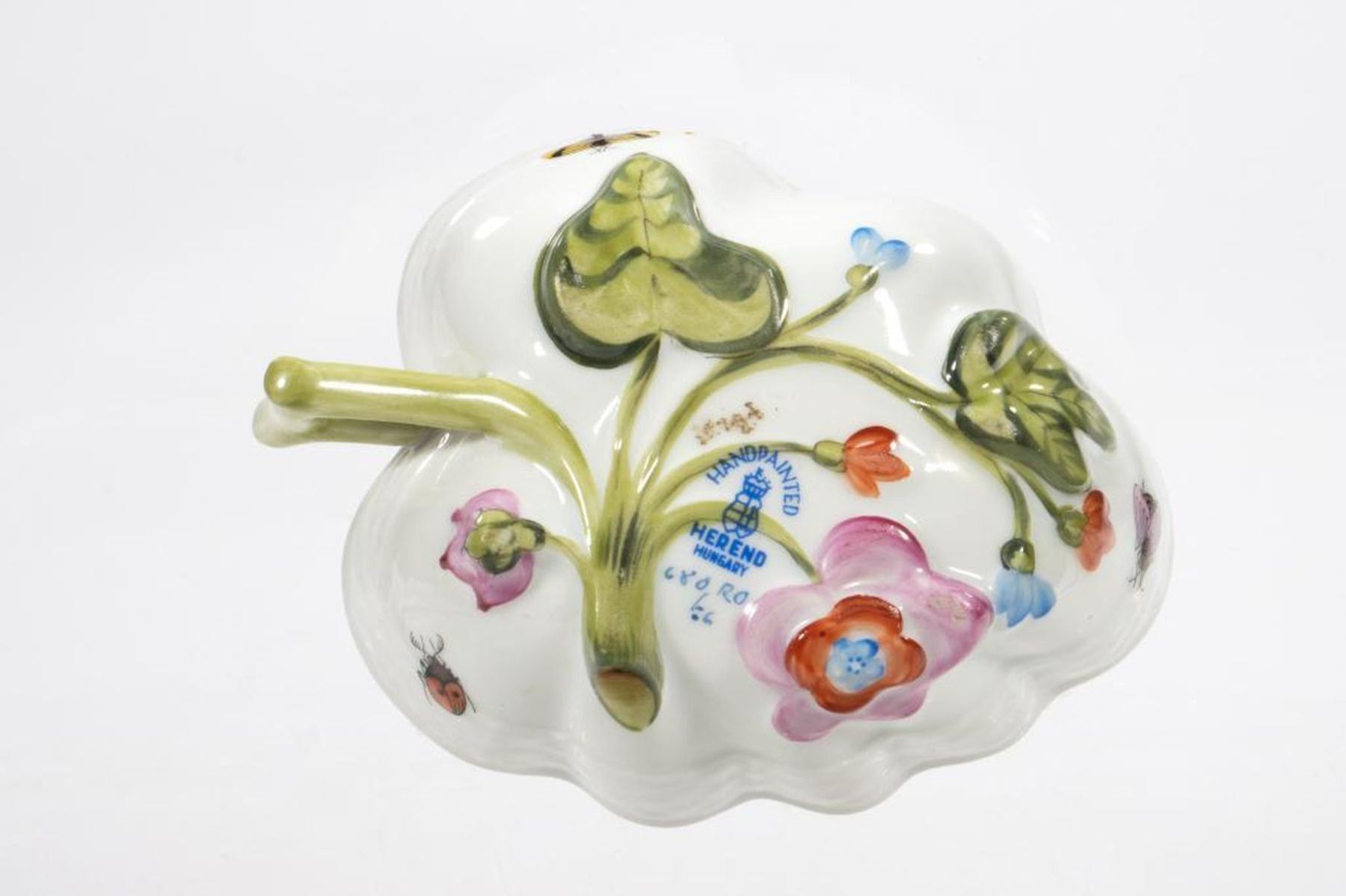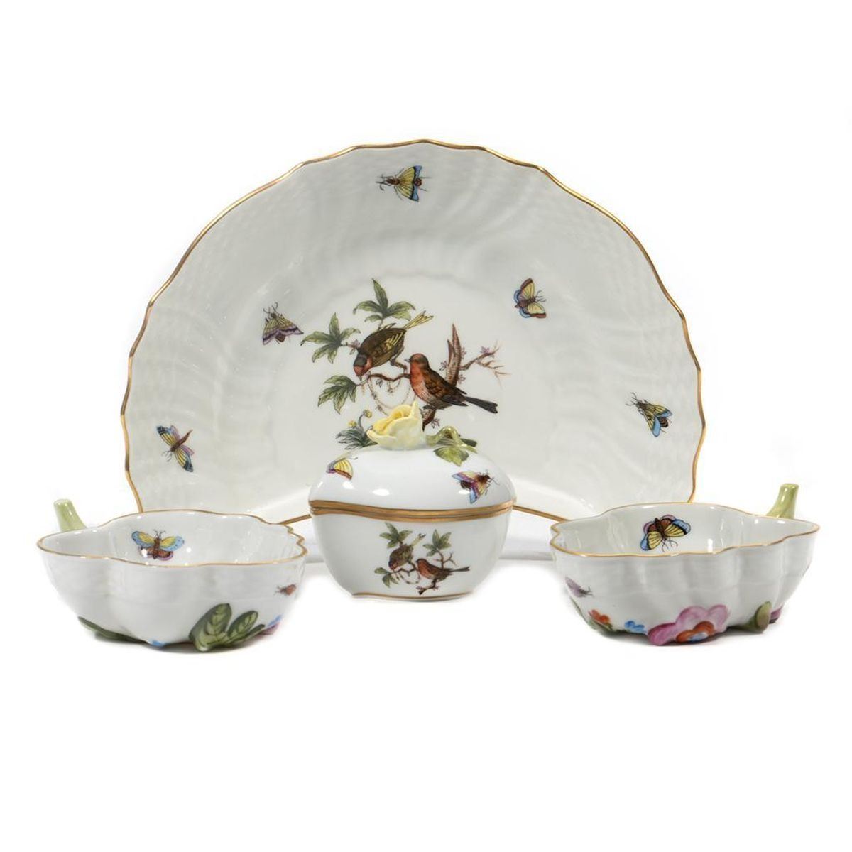 Including a covered box, two condiment bowls and a side plate all decorated with flora and fauna. Greatest length 9in.