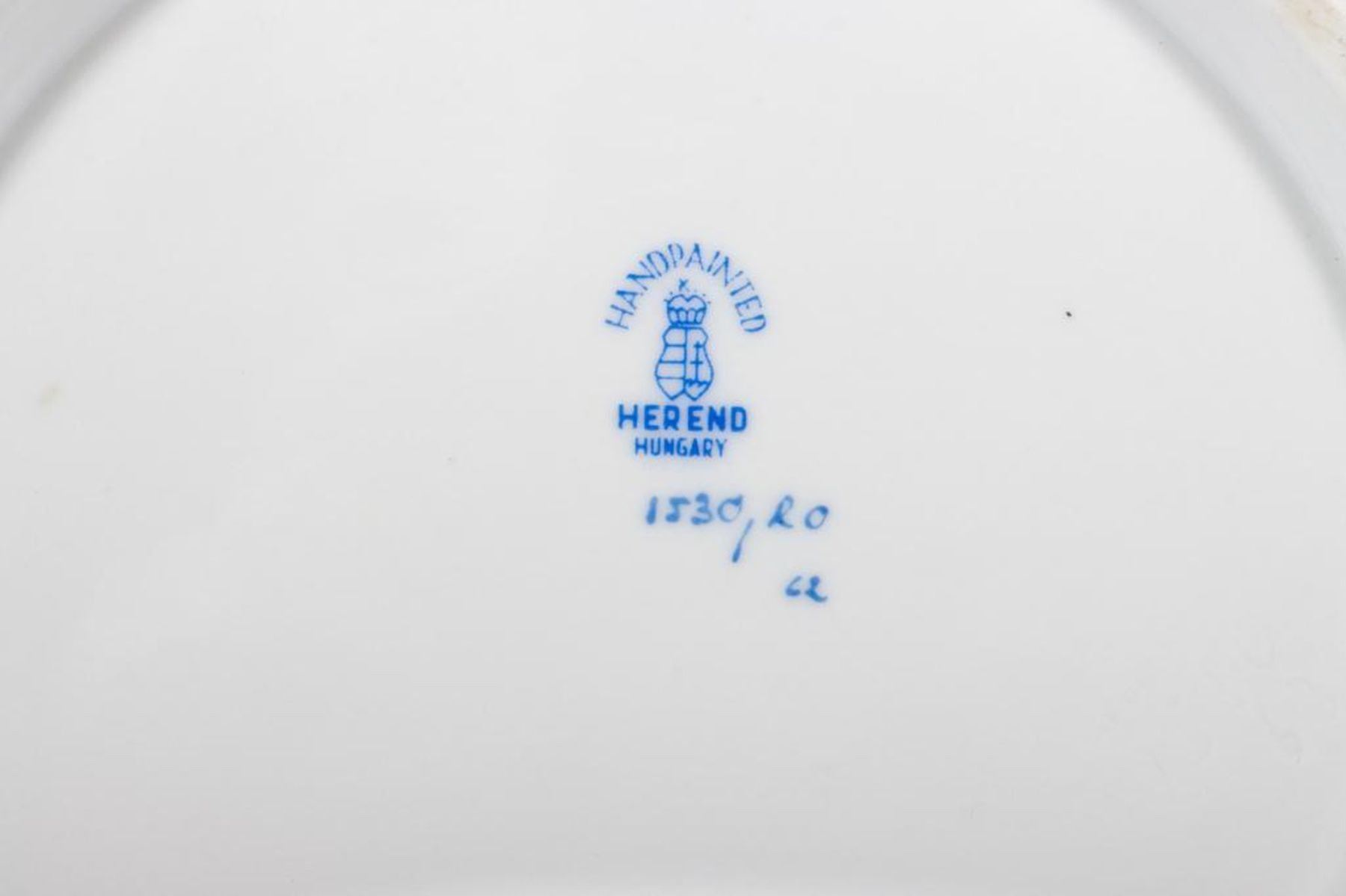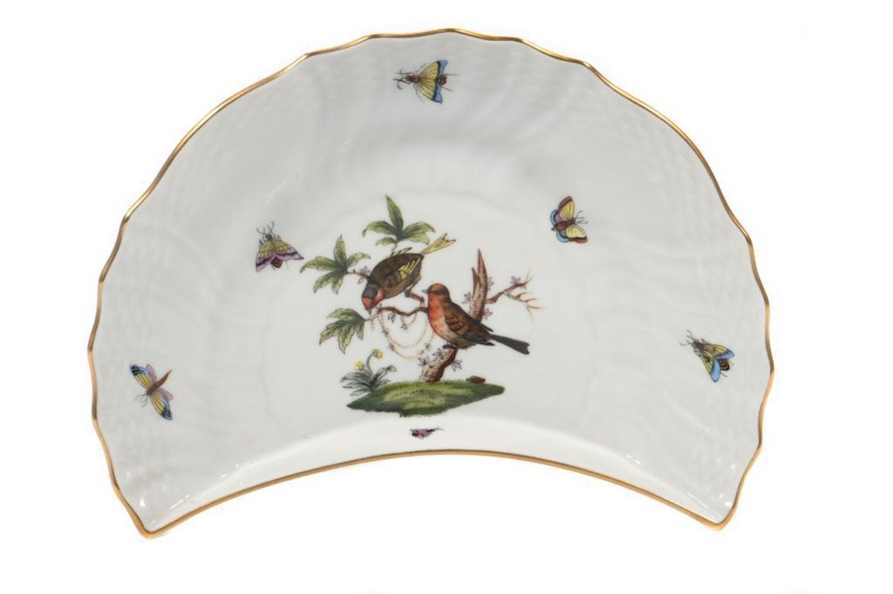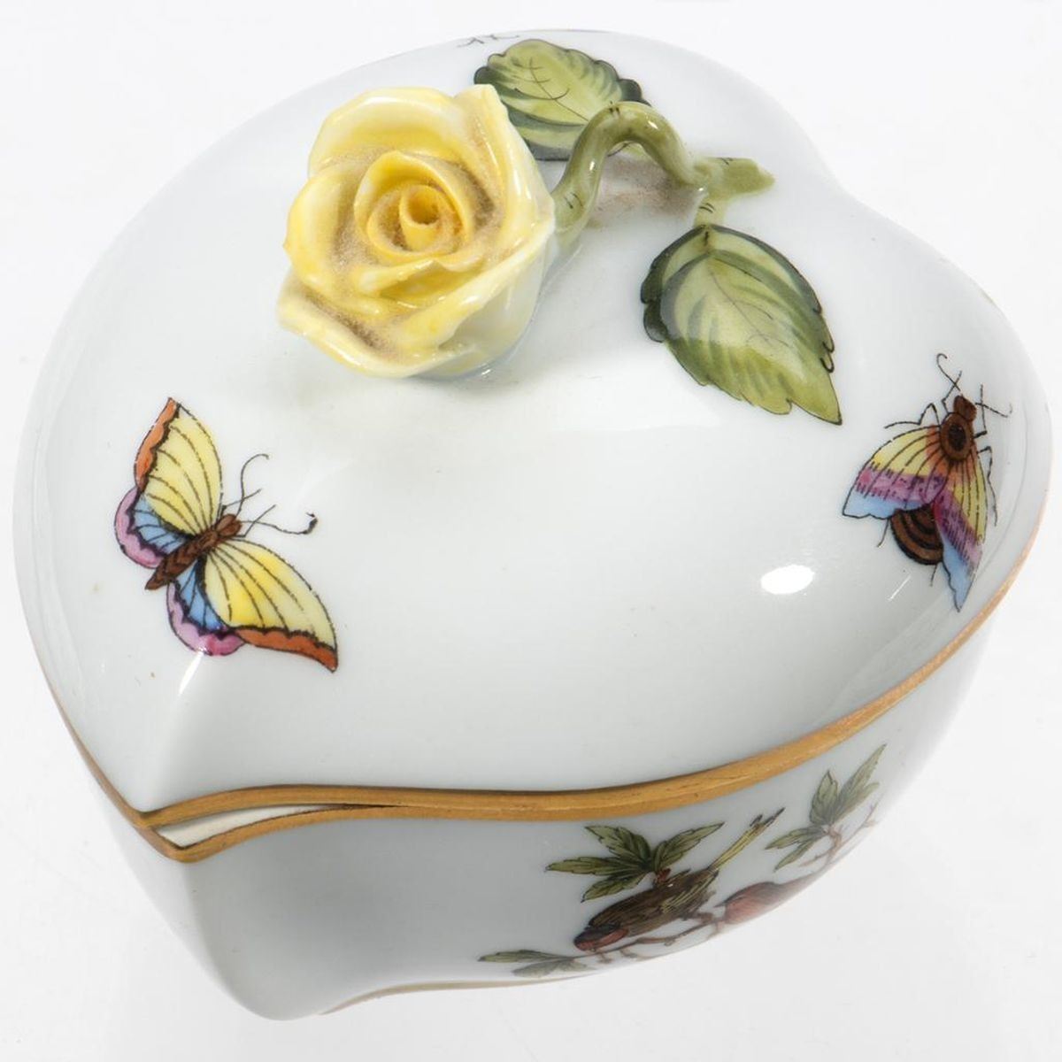 Including a covered box, two condiment bowls and a side plate all decorated with flora and fauna. Greatest length 9in.