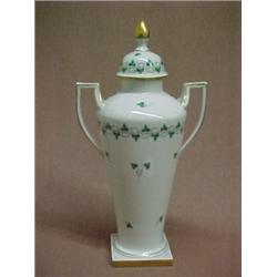 Herend porcelain handled urn with lid, gilt dome shaped finial on round lid, green stylized leaf decoration on white ground with gilt line accent, square base, marked on bottom Herend Hungary, and impressed Herend with number, measures 13" high