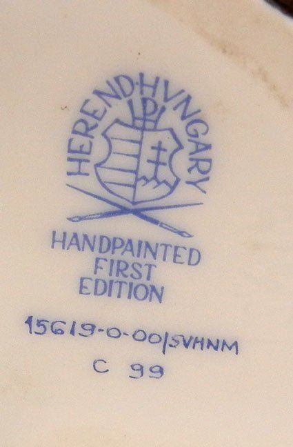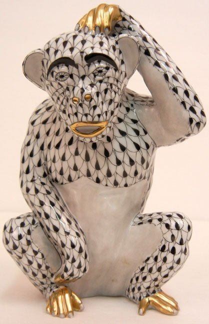 Herend porcelain monkey in black fishnet pattern, marked on bottom, 6 1/8" high