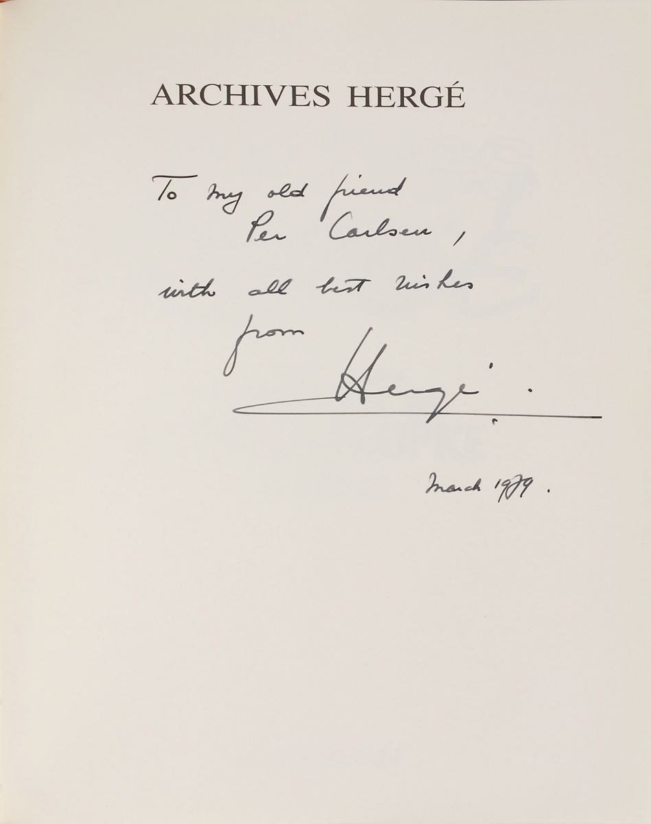 Famous Belgian cartoonist (1907–1983) best known for his comic book series The Adventures of Tintin. Signed book: Archives Herge. First edition. Tournai, Belgium: Casterman, 1978. Hardcover with dust jacket, 9 x 12, 258 pages. Signed and inscribed on the half-title page in black felt tip, “To my old friend, Per Carlsen, with all best wishes, from, Herge, March 1979.” In fine condition.