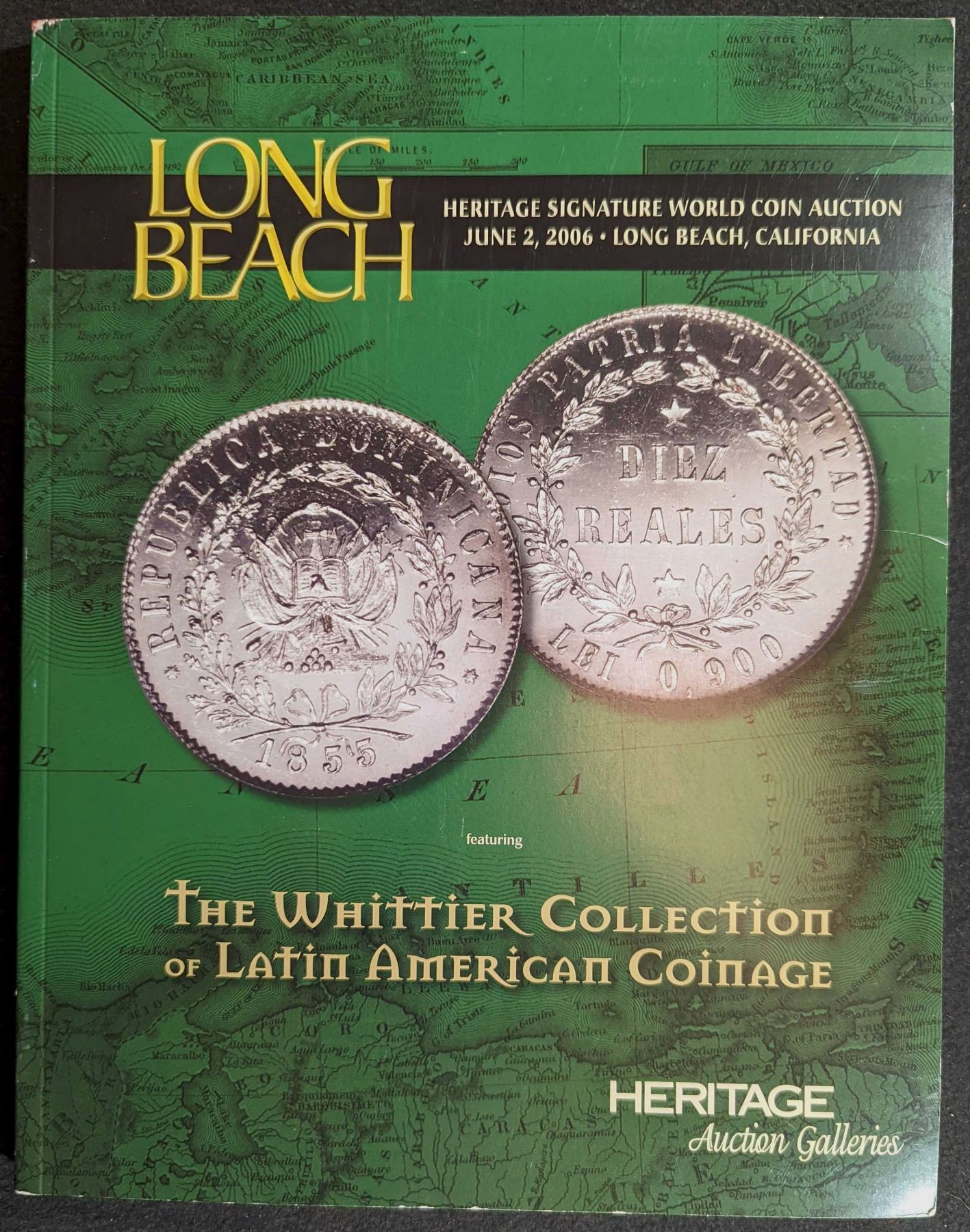 Heritage Auction Galleries. THE WHITTIER COLLECTION OF LATIN AMERICAN COINAGE. June 2, 2006. 16001-17667 Lots. 4to. This auction sale catalog includes numismatic material from Latin America with the focus on the coins of The Wittier Collection of Colonial and Republic gold, silver and copper coinage (1667 lots). Stand-alone section of the June 2, 2006, Heritage Signature World Coin Auction sale #410, Long Beach, original pictorial card covers, 166 pages, color plated throughout, fine, not listed in Gengerke. Lot weight: 1 lbs 7oz. Subject(s): Latin American Coinage.