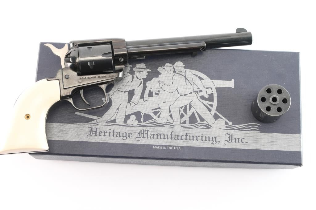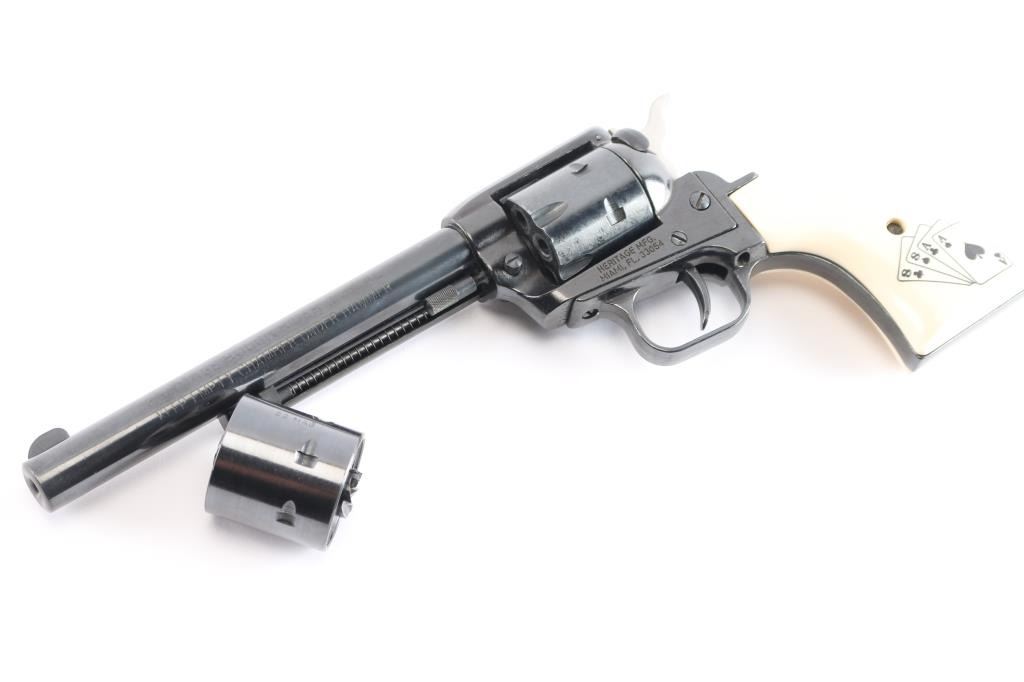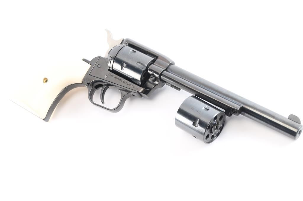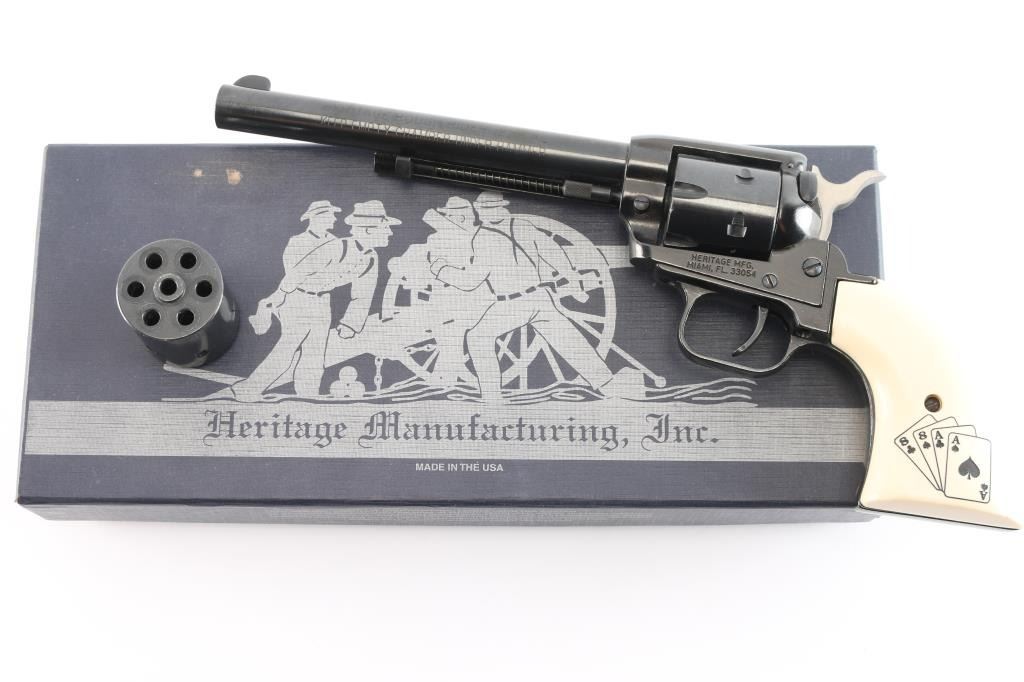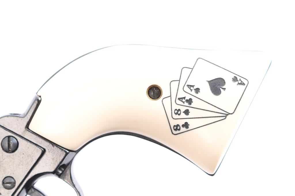 ‘Dead Man's hand' Edition’ Economical western style single action revolver with convertible .22 Long Rifle & .22 Magnum cylinders. Features a blued & black finish, 6 1/2" barrel, blade front sight, square notch rear sight, smooth trigger, knurled hammer spur, manual hammer block safety on the recoil shield, fluted six-shot .22 LR cylinder, ejector rod, alloy frame, alloy grip frame and two-piece faux-ivory synthetic grips with engraved “Aces & Eight's” poker hand on left panel. The hand Wild Bill Hickok supposedly was holding when he was killed. Includes the original blue and silver colored factory cardboard box with manual, catalogue and fluted .22 Mag cylinder. Revolver retains approximately 99% of its original finish showing light wear and scattered dings. Action is smooth with good lock-up, the bore is excellent and the synthetic grips are fine.