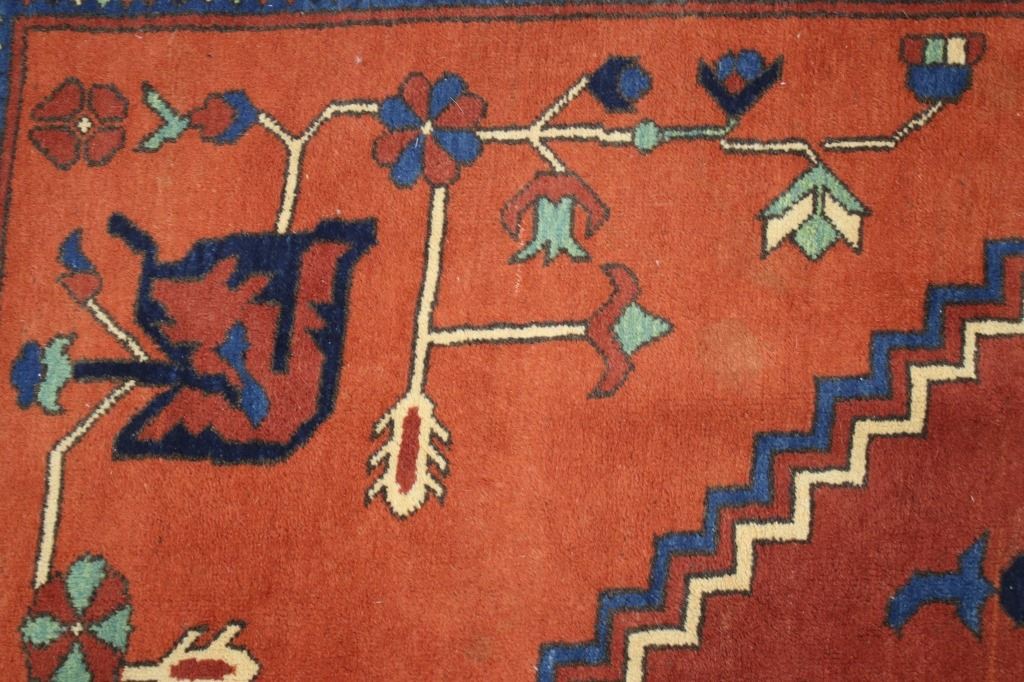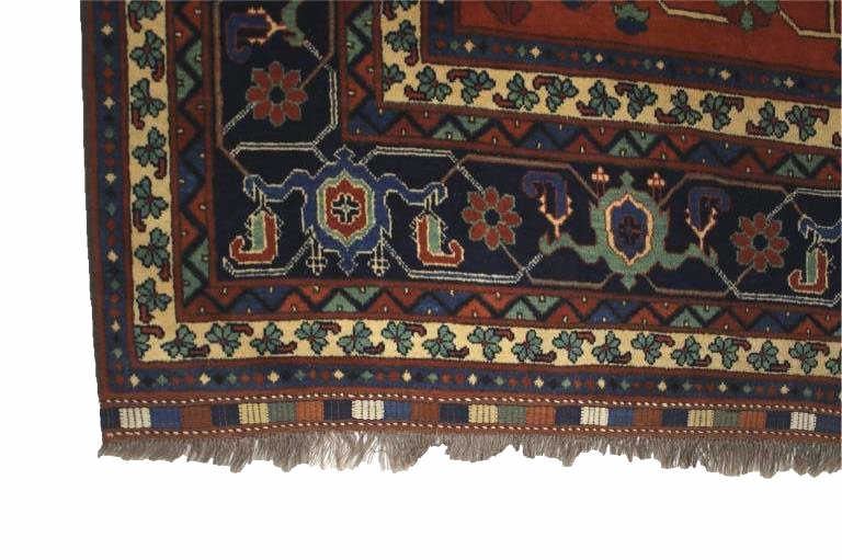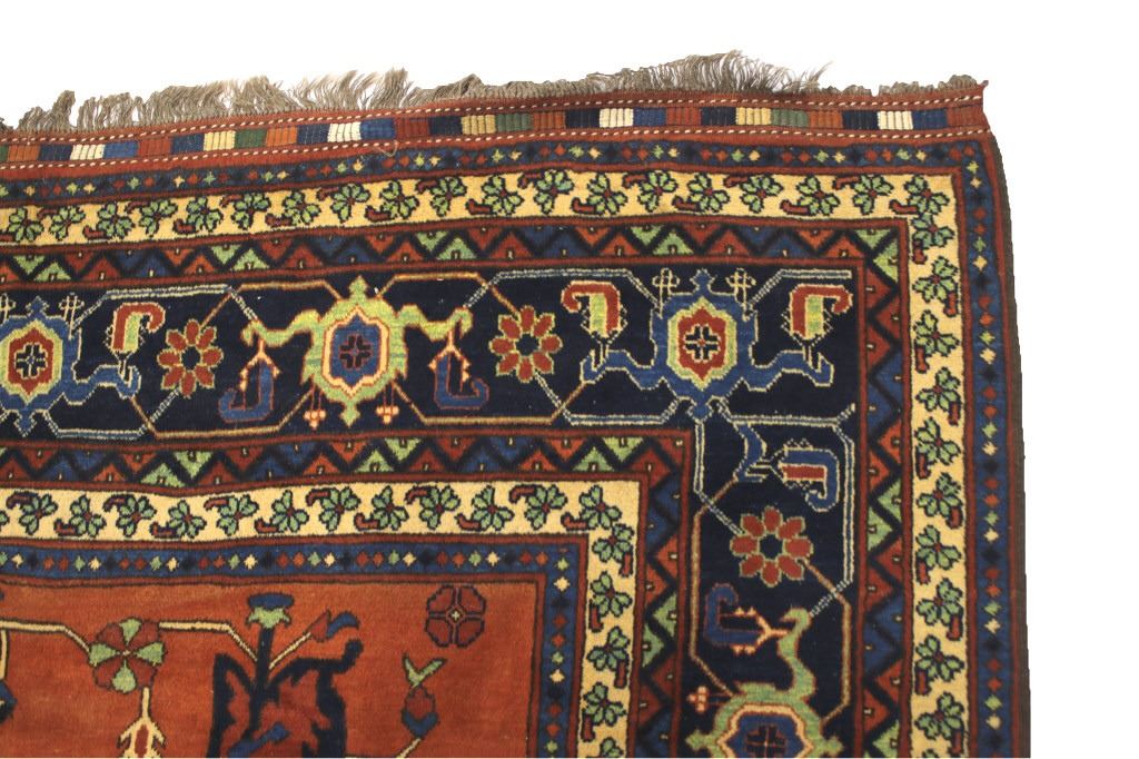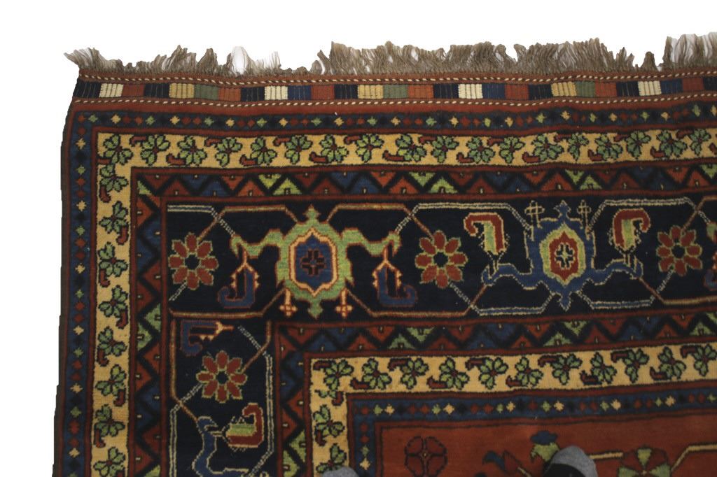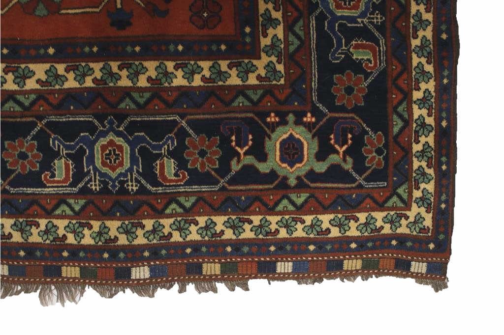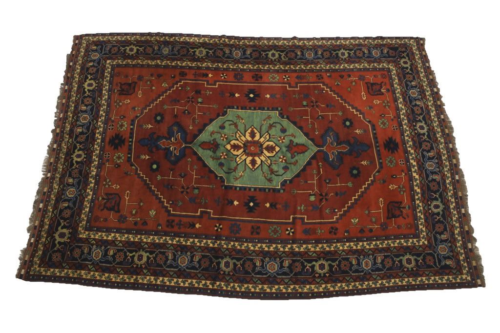 Included in this lot is a Persian Heriz Serapi hand knotted wool area rug. This hand woven rug originates from the 1980's. The rug features a fine detailed design, bright colors, and a tight weave. The Heriz rug is one of the most well-known styles of Persian rugs, known for its unique styles and patterns. The rugs are produced in the city of Heriz, which is located in northwestern Iran near the city of Tabriz. The piece shows geometric floral patterns along the border, with the center of the rug showing large geometric medallions. The rug is predominately blue with red, green, tan, and navy. The rug shows good condition overall, with little to no wear. The piece measures 109" wide by 162" long.