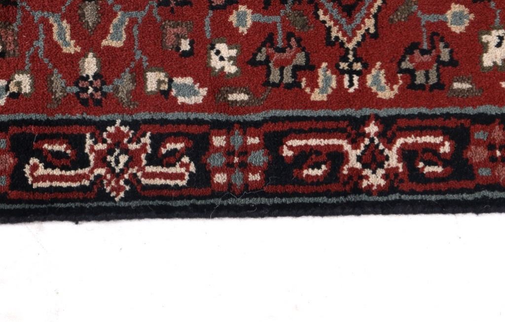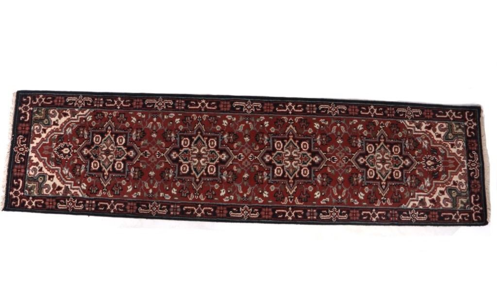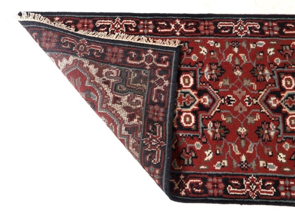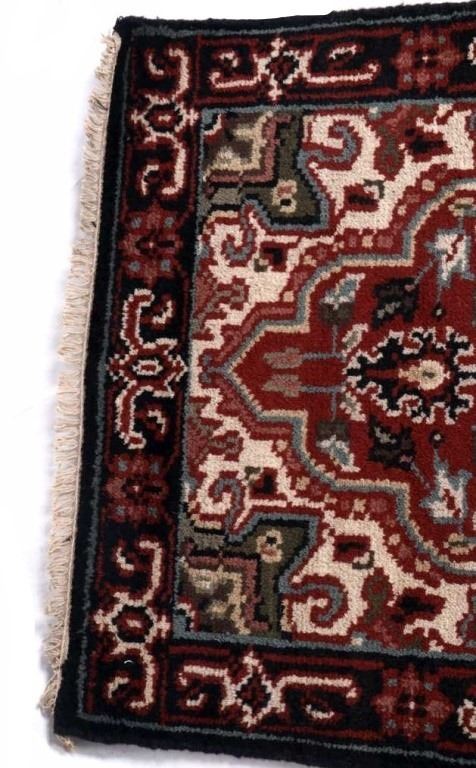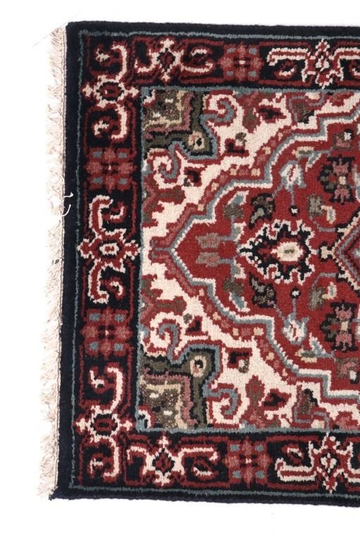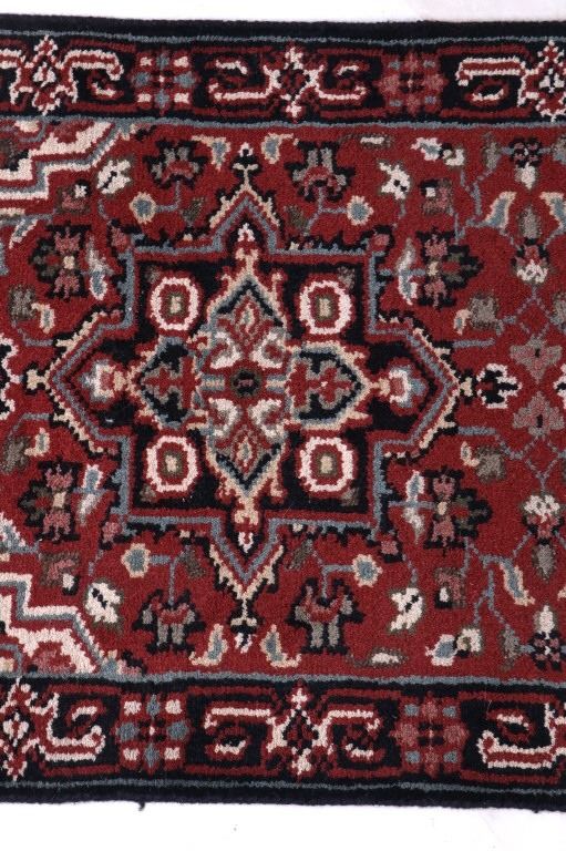 Included in this lot we have a Persian Heriz Serapi hand knotted wool runner rug. The rug features a fine detailed design, bright colors, and a tight weave. The Heriz rug is one of the most well known styles of Persian rugs known for its unique styles and patterns. The rugs are produced in the city of Heriz, which is located in Northwestern Iran near the city of Tabriz. The piece shows geometric floral patterns along the border with the center of the rug showing large geometric medallions. The rug is predominately a deep red color with black, white, blue, orange, tan, and green throughout the piece. The rug shows good condition overall,with little to no wear. The piece measures 31 1/4" wide by 120" long.