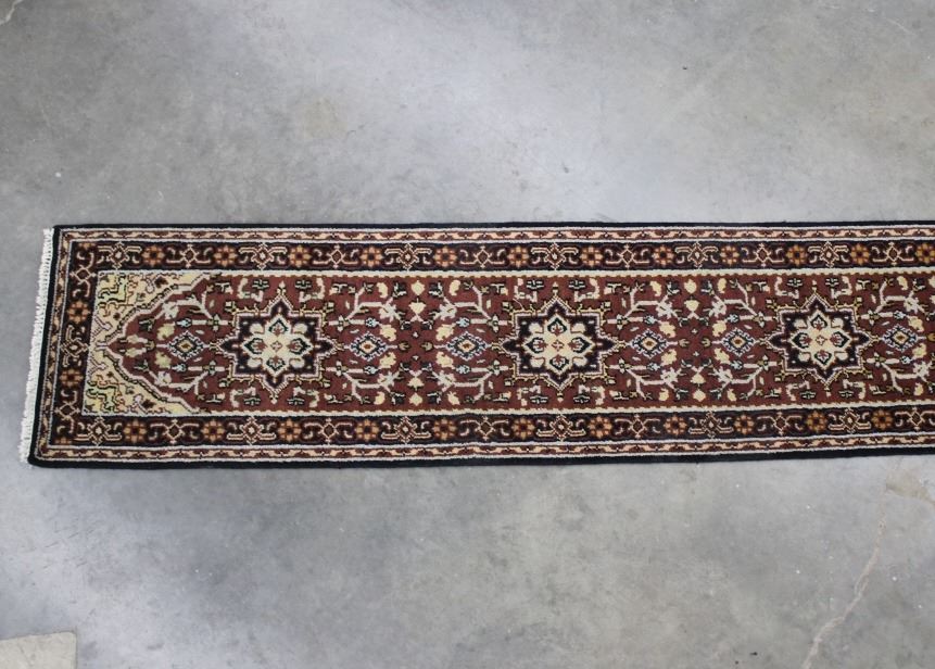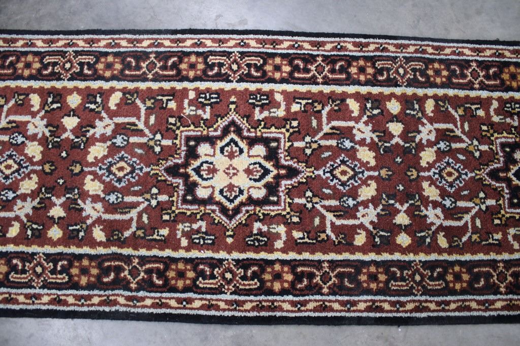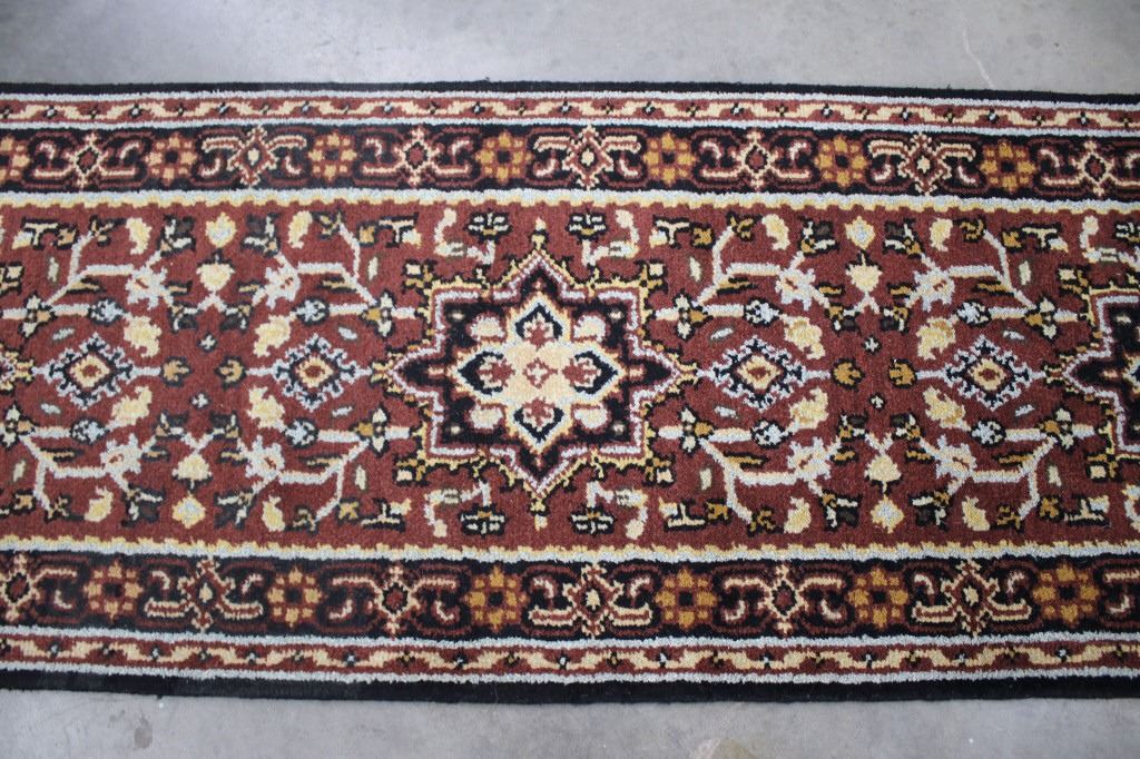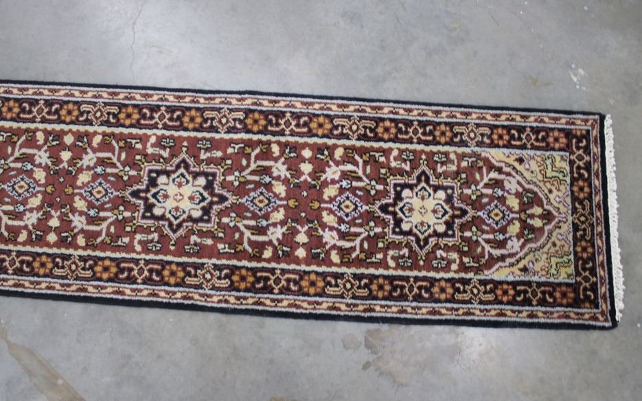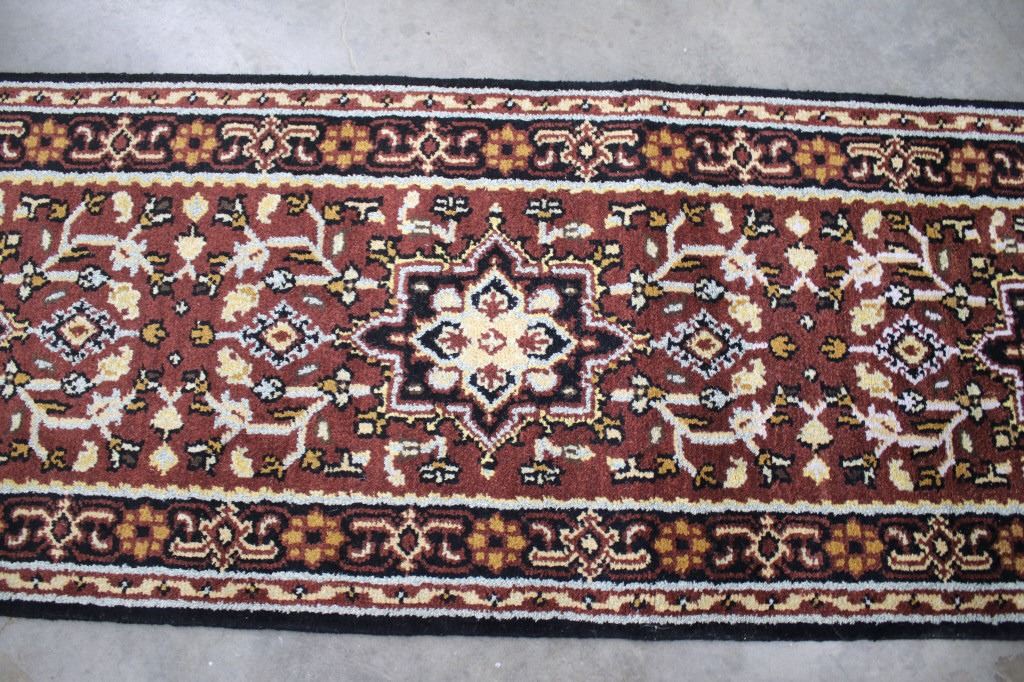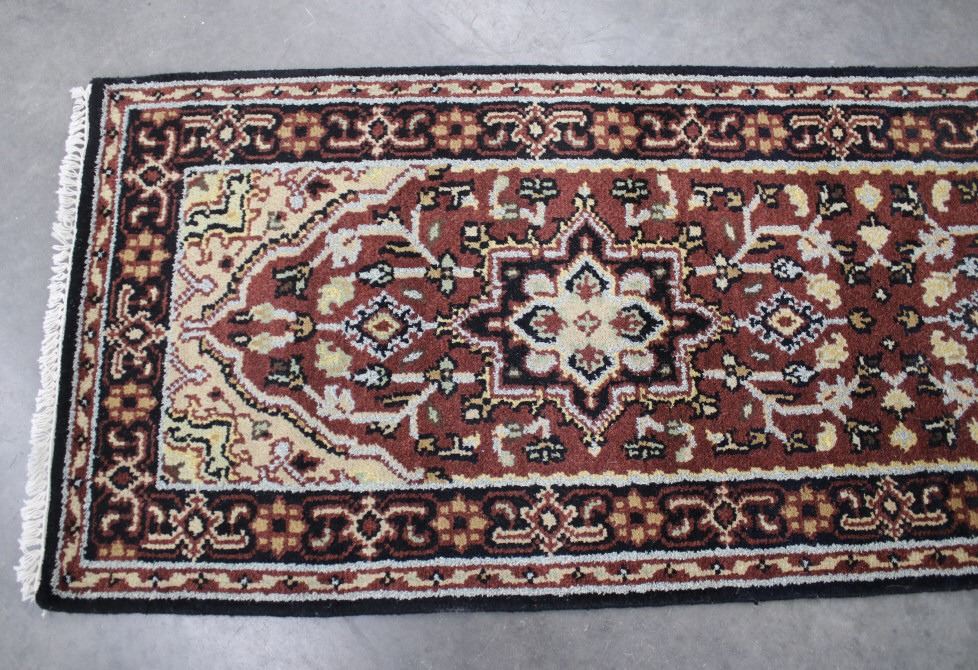 Included in this lot is a Persian Heriz Serapi hand knotted wool runner rug. The rug features a fine detailed design, bright colors, and a tight weave. The Heriz rug is one of the most well-known styles of Persian rugs, known for its unique styles and patterns. The rugs are produced in the city of Heriz, which is located in northwestern Iran near the city of Tabriz. The piece shows geometric floral patterns along the border, with the center of the rug showing large geometric medallions. The rug is predominately a deep red color with black, blue, yellow, and grey throughout the piece. The rug shows good condition overall, with little to no wear. The piece measures 30" wide by 184" long.