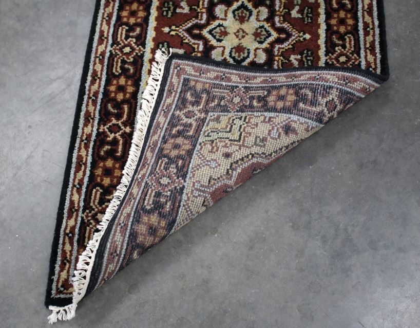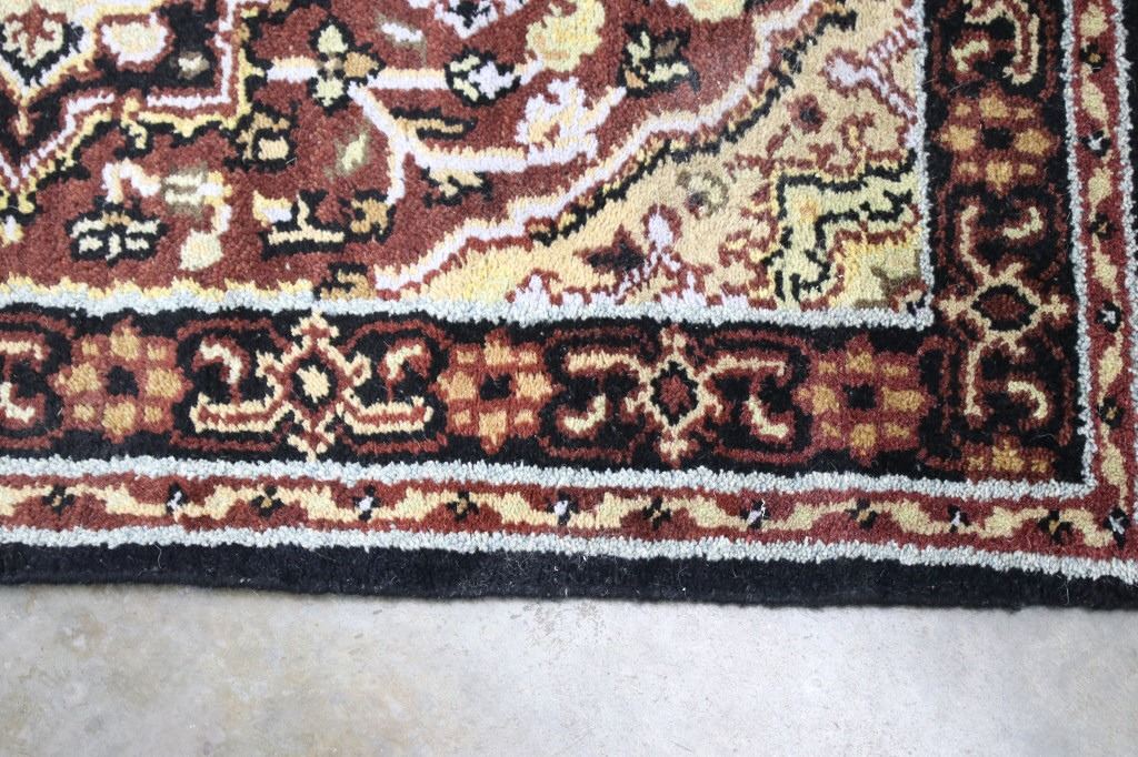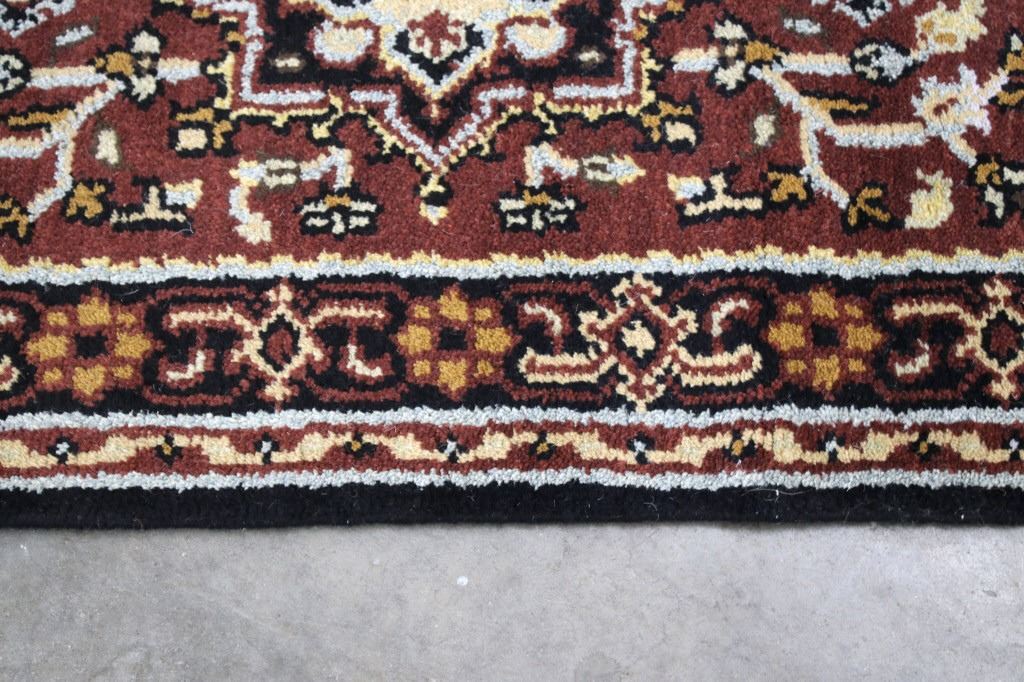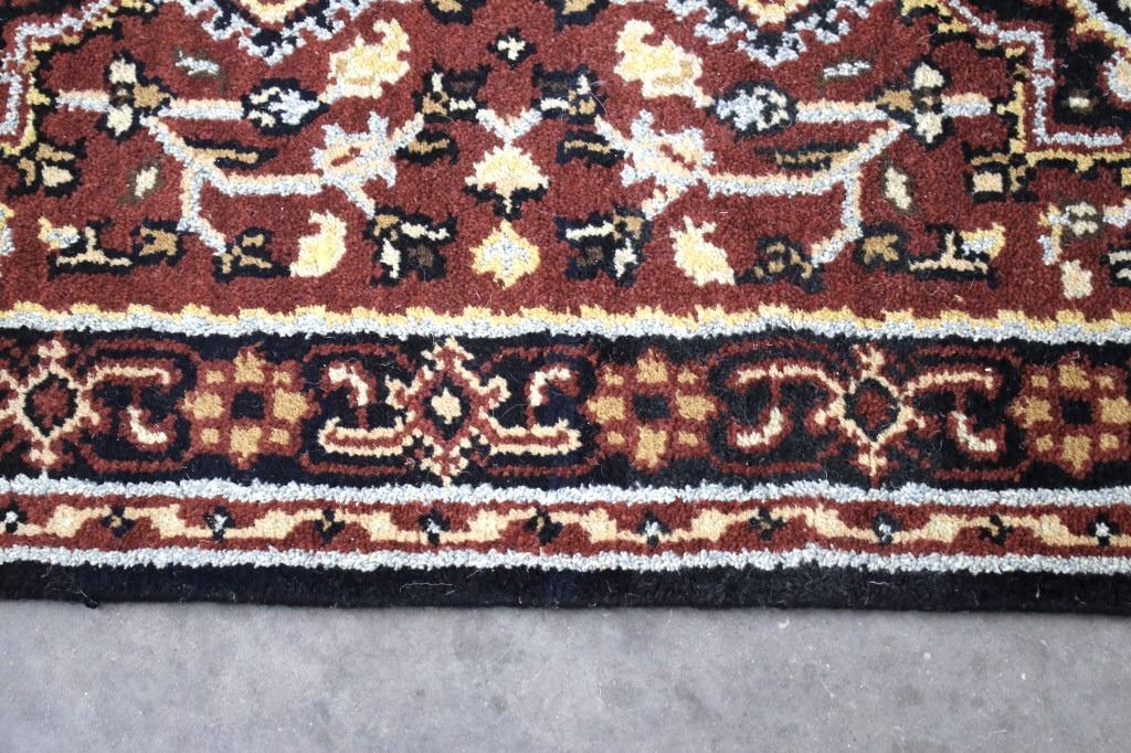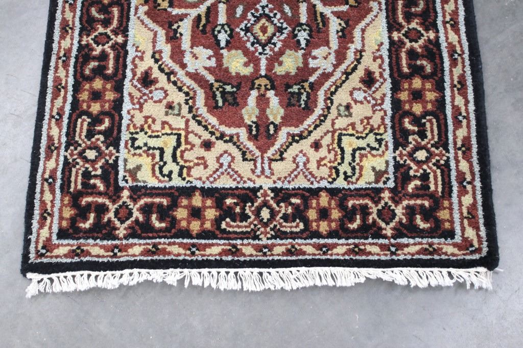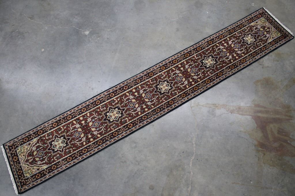 Included in this lot is a Persian Heriz Serapi hand knotted wool runner rug. The rug features a fine detailed design, bright colors, and a tight weave. The Heriz rug is one of the most well-known styles of Persian rugs, known for its unique styles and patterns. The rugs are produced in the city of Heriz, which is located in northwestern Iran near the city of Tabriz. The piece shows geometric floral patterns along the border, with the center of the rug showing large geometric medallions. The rug is predominately a deep red color with black, blue, yellow, and grey throughout the piece. The rug shows good condition overall, with little to no wear. The piece measures 30" wide by 184" long.