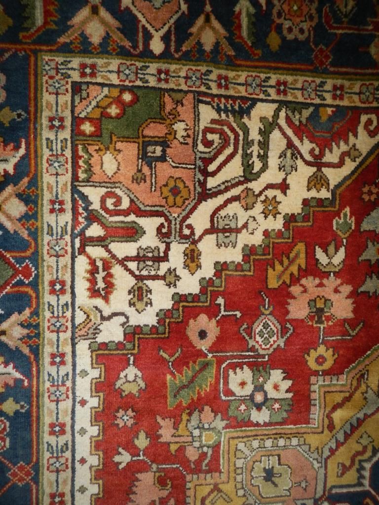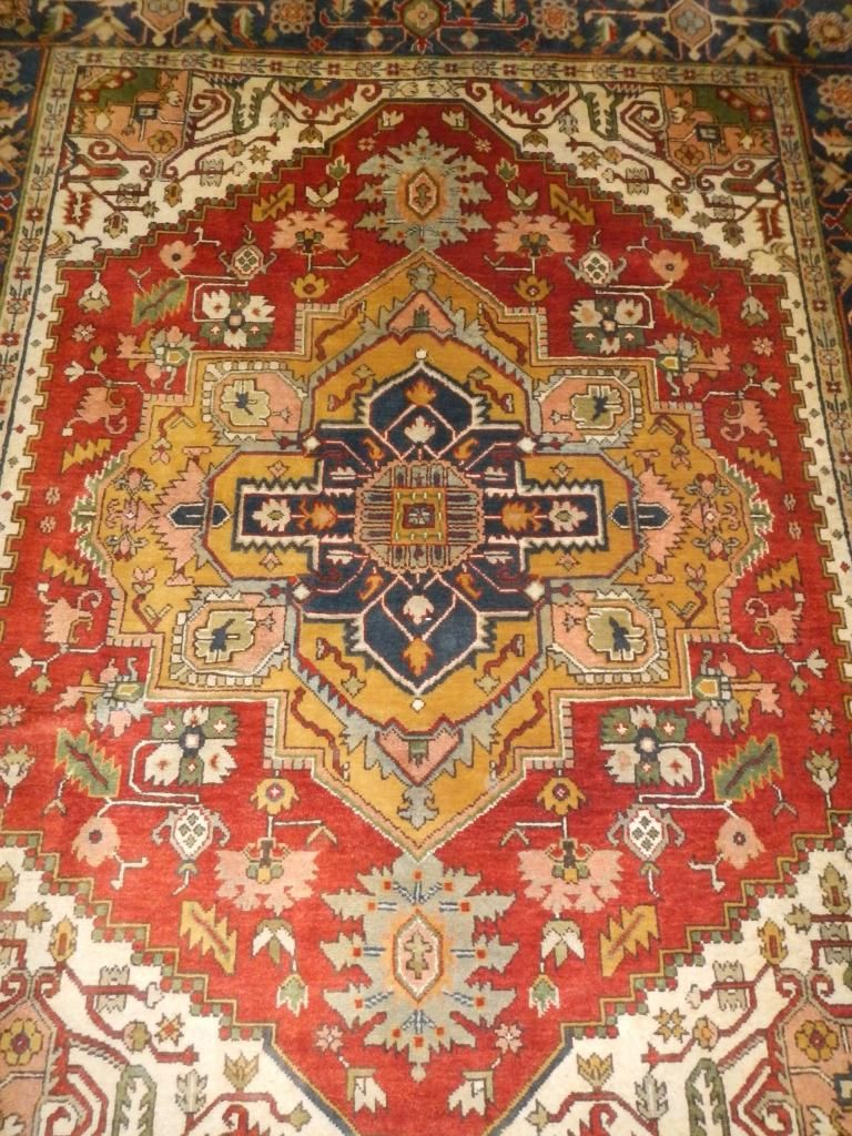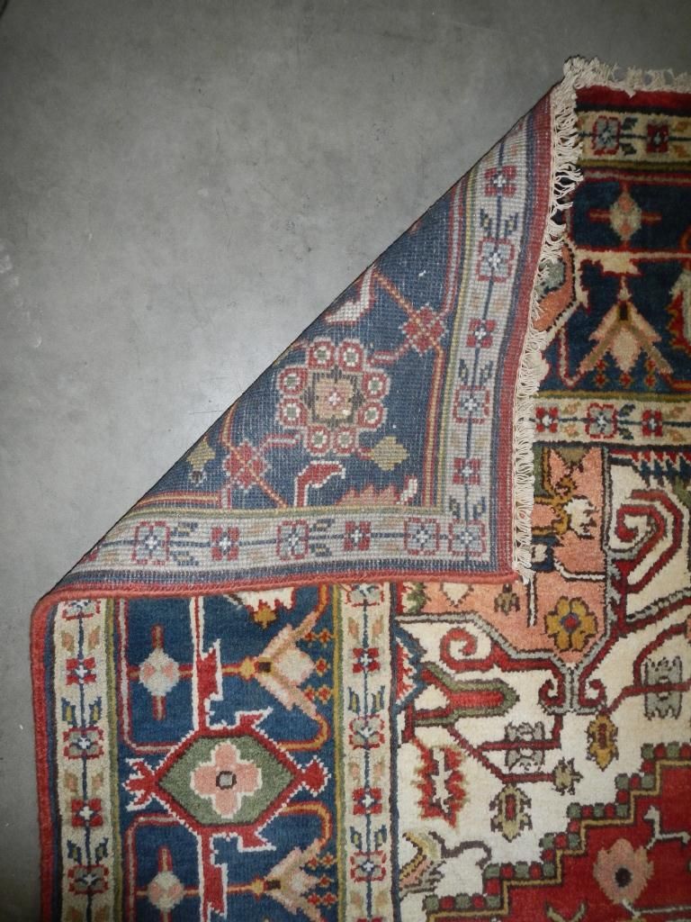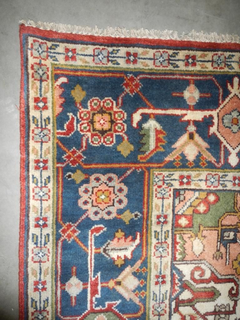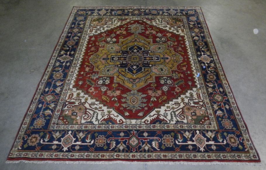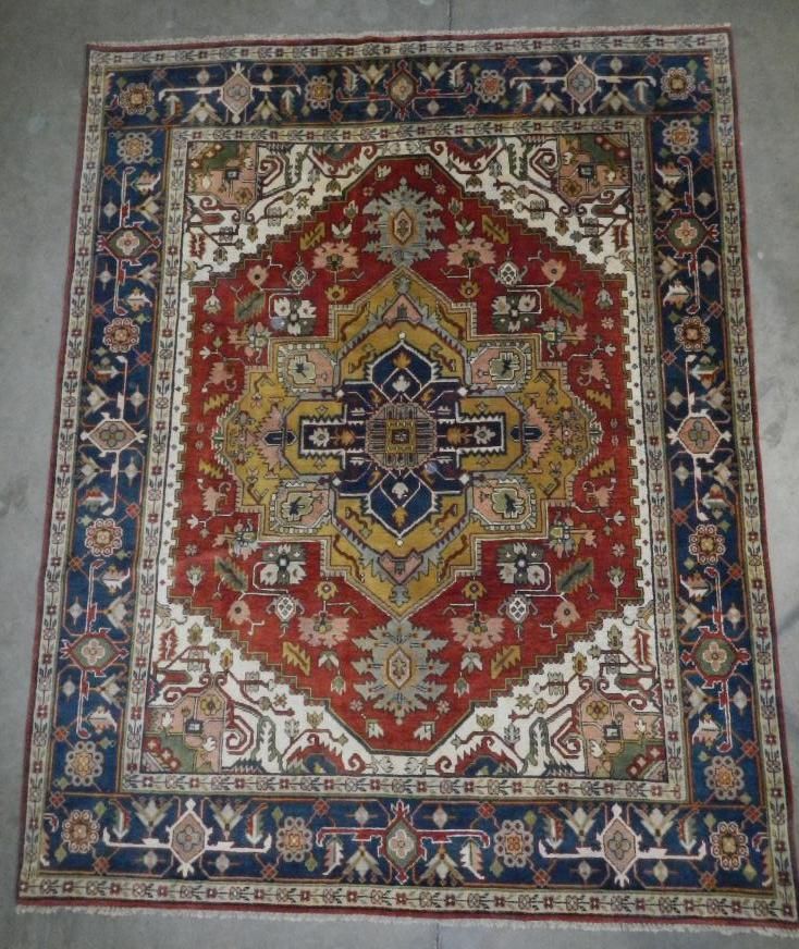 Heriz Serapi Rug This rug is Hand Woven in India 100% Wool Pile. Heriz Serapi is a old Persian Pattern, identified by the corners with a center Medallion and Geometric Shaped. Made with New Zealand Wool. Sized at 8.1'x10'