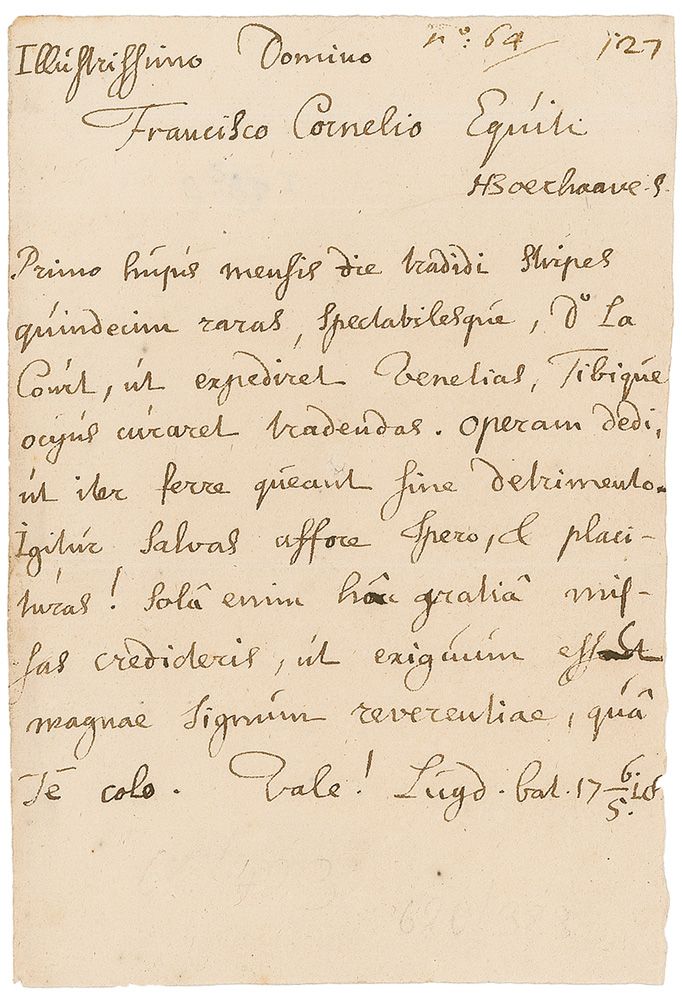Dutch botanist, humanist, and physician (1668–1738). He is regarded as the founder of clinical teaching and of the modern academic hospital. Third person ALS, in Latin, signed “H. Boerhaave,” one page, 4 x 5.75, no date. In full (translated): “To the illustrious gentleman Chevalier Franz Cornelius from H. Boerhaave. On the first day of this month have I received fifteen rare and excellent medicinal plants brought to me from Venice by Mr. La Court, and thought you might appreciate some and these would bring you on your trip a small sign of my respectful appreciation.” In fine condition, with a horizontal fold and some scattered light toning. This letter is reproduced in the classic German book of Hans-Rudolf Wiedemann, Letters of Great Scientists and Naturalists published in Lübeck in 1989.