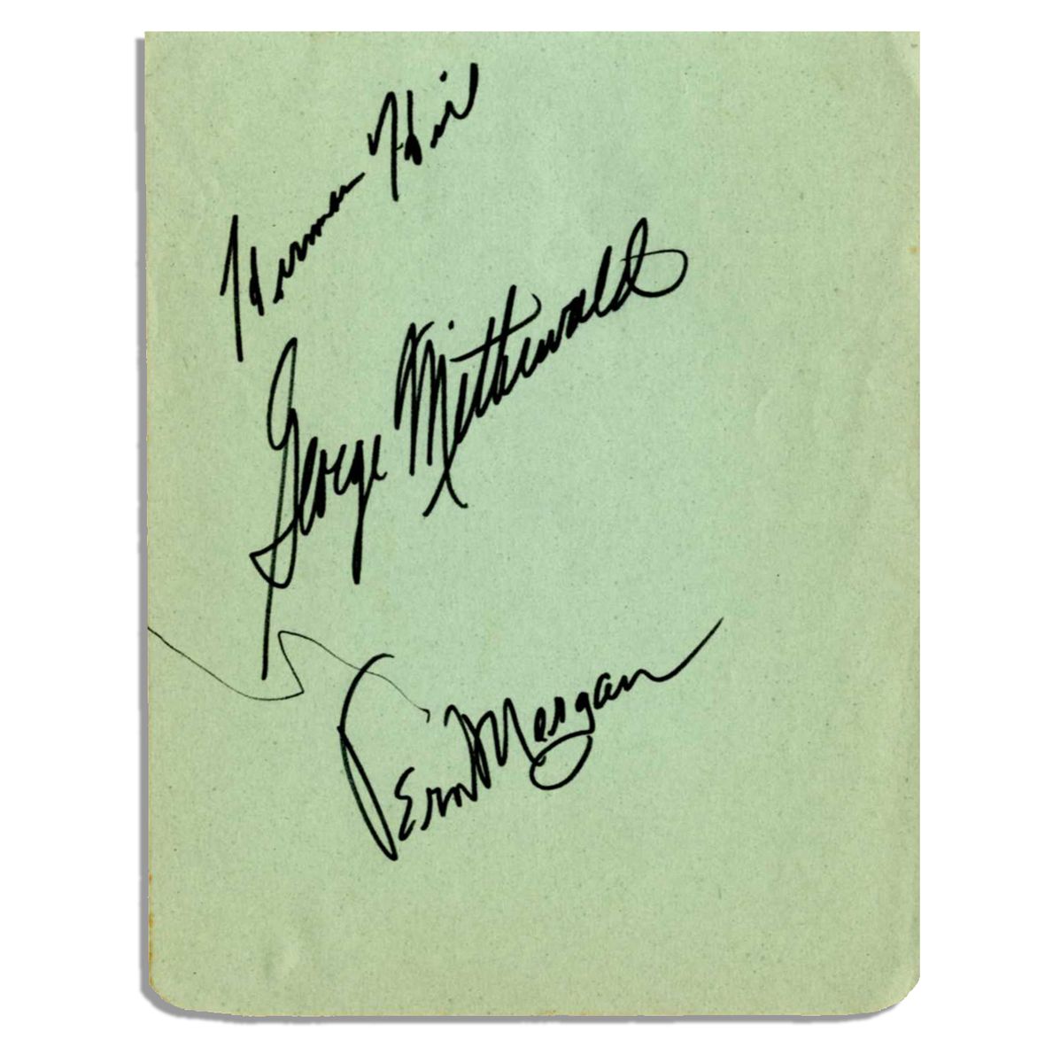 Herman Hill signs this page alongside Vern Morgan and George Mitterwald. Hill played for the Minnesota Twins in 1969 and 1970 before he tragically drowned off the Venezuelan coast in 1970 at age 25. Vern Morgan played for the Cubs in 1954-55 and George ''The Baron'' Mitterwald played for both the Cubs and Twins during the 1960's and 70's. Page measures 4.5'' x 5.75''. Toning, else near fine.