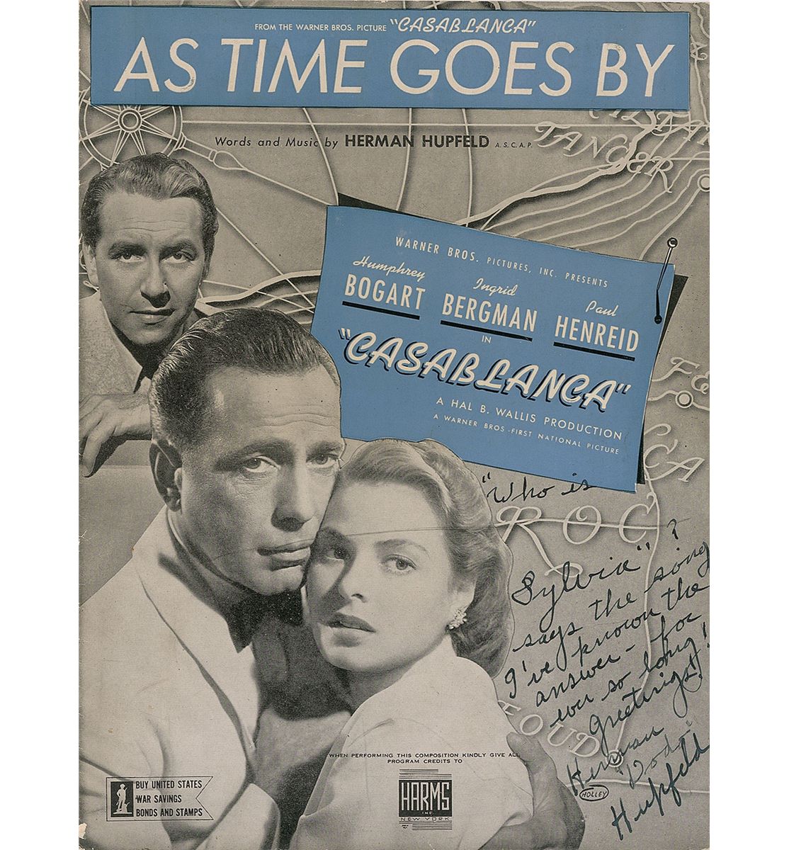 Songwriter (1894–1951) known for his Broadway compositions. Vintage sheet music for ‘As Time Goes By’ from Casablanca, 9 x 12, five pages, signed and inscribed on the front cover in fountain pen, “‘Who is Sylvia’? Says the song I’ve known the answer—for ever so long! Greetings, Herman ‘Dodo’ Hupfeld.” A light horizontal mark to the surface and chipping to lower left corner, otherwise fine condition.
