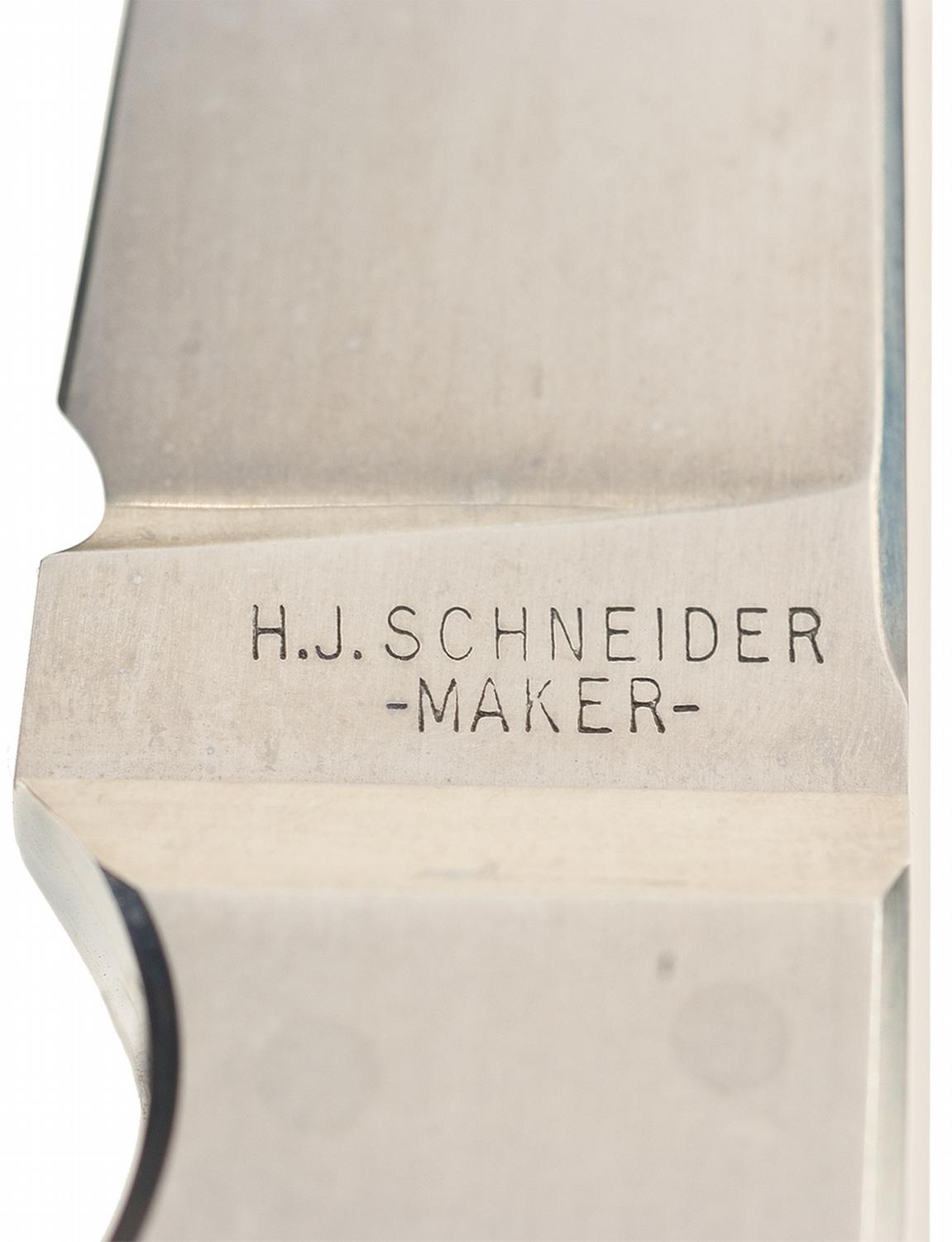 This knife was handcrafted by legendary knifemaker Herman Schneider. The knife features a 3 inch blade marked "H.J. SCHNEDER" / -MAKER-". Fitted with mother of pearl scales secured to the tang with six rivets. Herman Schneider is now retired from the knife making business. OAL: 6 7/8".