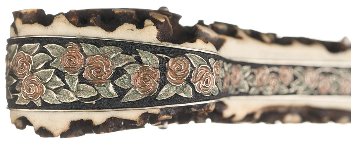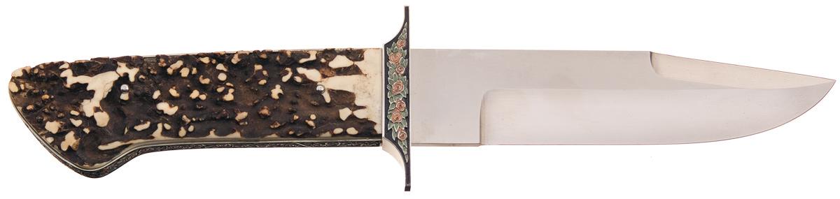 This knife was handcrafted by legendary knife maker Herman Schneider. The knife features a 5 1/2 inch blade marked "H.J. SCHNEIDER / -MAKER-". The guard and tang are meticulously engraved with a spectacular multi-colored gold rose blossom and leaf engraving on a black background. The knife is fitted with stag scales secured to the tang with two rivets. OAL: 10 1/2". Herman Schneider is now retired from the knife making business.