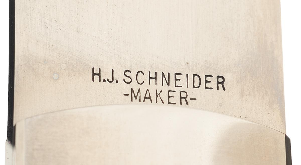 This knife was handcrafted by legendary knife maker Herman Schneider. The blade is 3 7/8 inches long and is marked "H.J. SCHNEIDER / -MAKER-". Fitted with stag scales secured to the tang with two large rivets. OAL: 8". Herman Schneider is now retired from the knife making business.