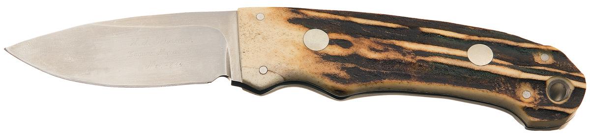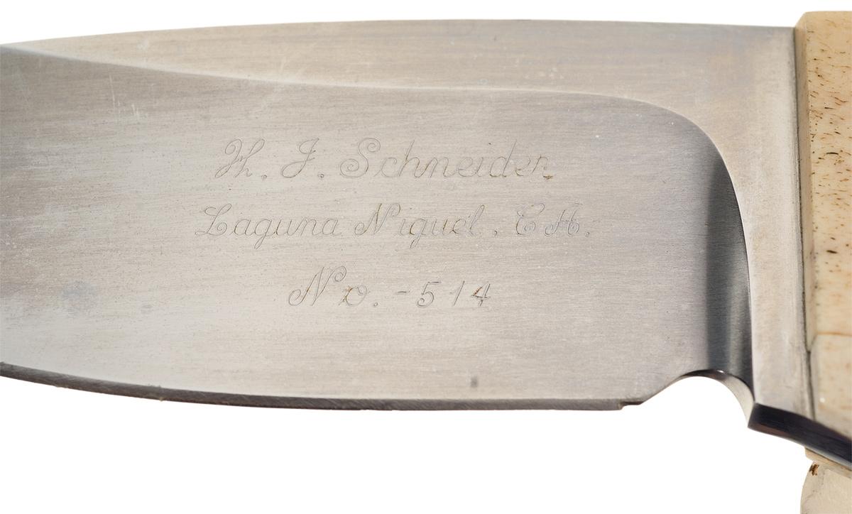 This knife was handcrafted by legendary knifemaker Herman Schneider. The blade is 2 7/8 inches long and is script marked "H.J. Schneider / Launa Niguel, CA. / No.-514". Fitted with stag scales with lanyard hole and secured to the tang with six rivets. No provisions for front or rear bolsters. Herman Schneider is now retired from the knife making business. OAL: 7"