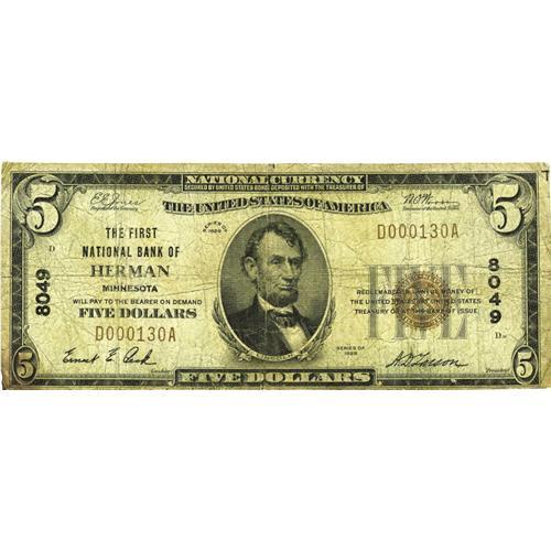 <B>Herman, MN</B></I> - $5 1929 Ty. 1 <B>The First NB</B></I> Ch. # 8049<BR>The census for this remote Grant County locale lists just one of this type and denomination. Since a serial is not included, we are unable to determine if this is that example or an addition to the census. Whichever the correct answer, this is a very scarce and challenging issuer. <B>Very Good.</B></I>