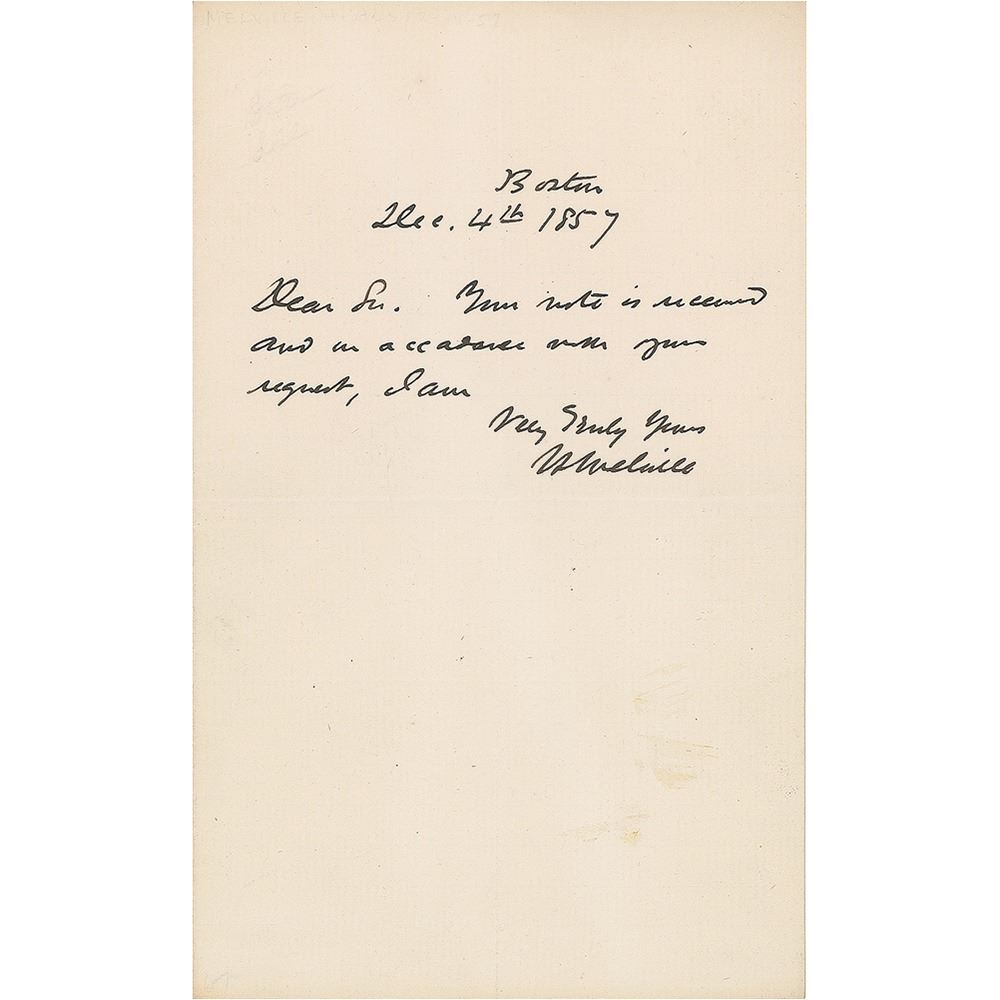 Choice ALS signed "H. Melville," one page, 5 x 8, December 4, 1857. Letter to a gentleman written from Boston. In full: "Your note is received and in accordance with your request, I am very truly yours." In fine condition.