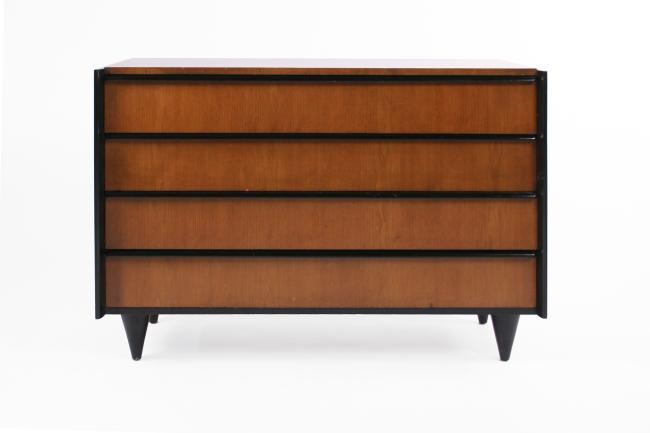 33h x 48w x 19d inches, black refinished wooden base, mahogany drawers, original good condition, unrestored