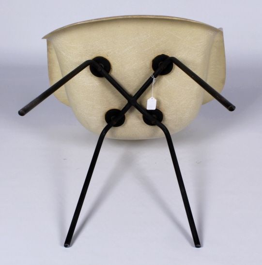 This is known to have been built 1953. These chairs were first hit the market in 1950. The chair features a fiber glass shell with solid steel legs and a fabric cushion. This is a Herman Miller Piece designed by Ray Eames. There is a 'D' stamped in the center of the steel frame and flat rasp screws fixing the legs to the shell giving this the 1953 date given to us by the Herman Miller Company Product Resources (making this an authentic genuine piece). The dimensions of the piece is 30.875" to the top of the seat back and 24.875" wide and 18.125" deep seat. (NOTE the chair is missing all four bootdome glides).