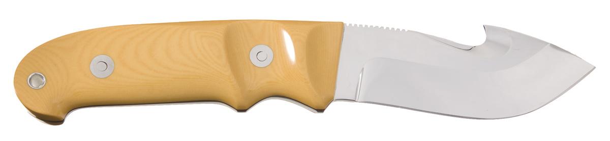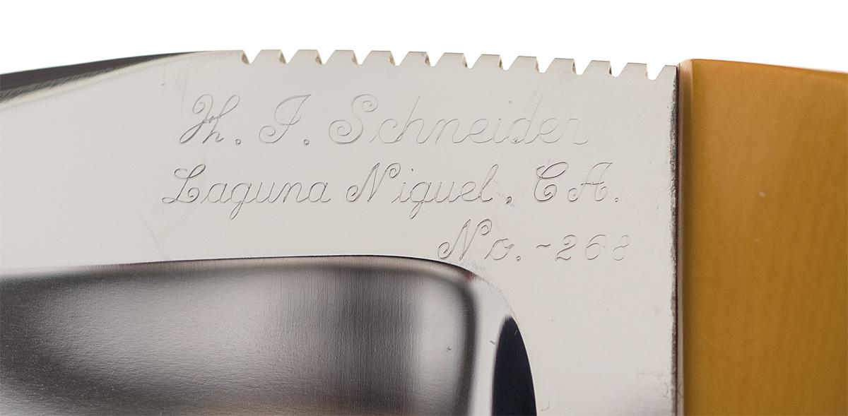 This knife was handcrafted by legendary knife maker Herman Schneider with a Thomas Lamb designed utility handle, circa late 70s early 80s. The knife has a 3 3/4 inch blade script marked "H.J. Schneider / Laguna Niguel, CA. / No.-268" and has file work on the spine. Fitted with ivory micarta scales secured to the tang with two rivets. OAL: 8 1/2".