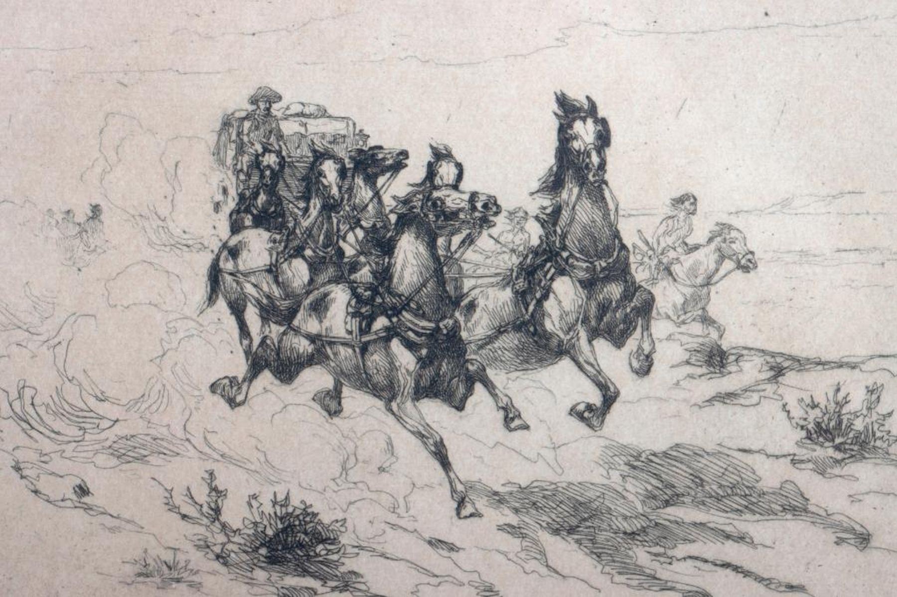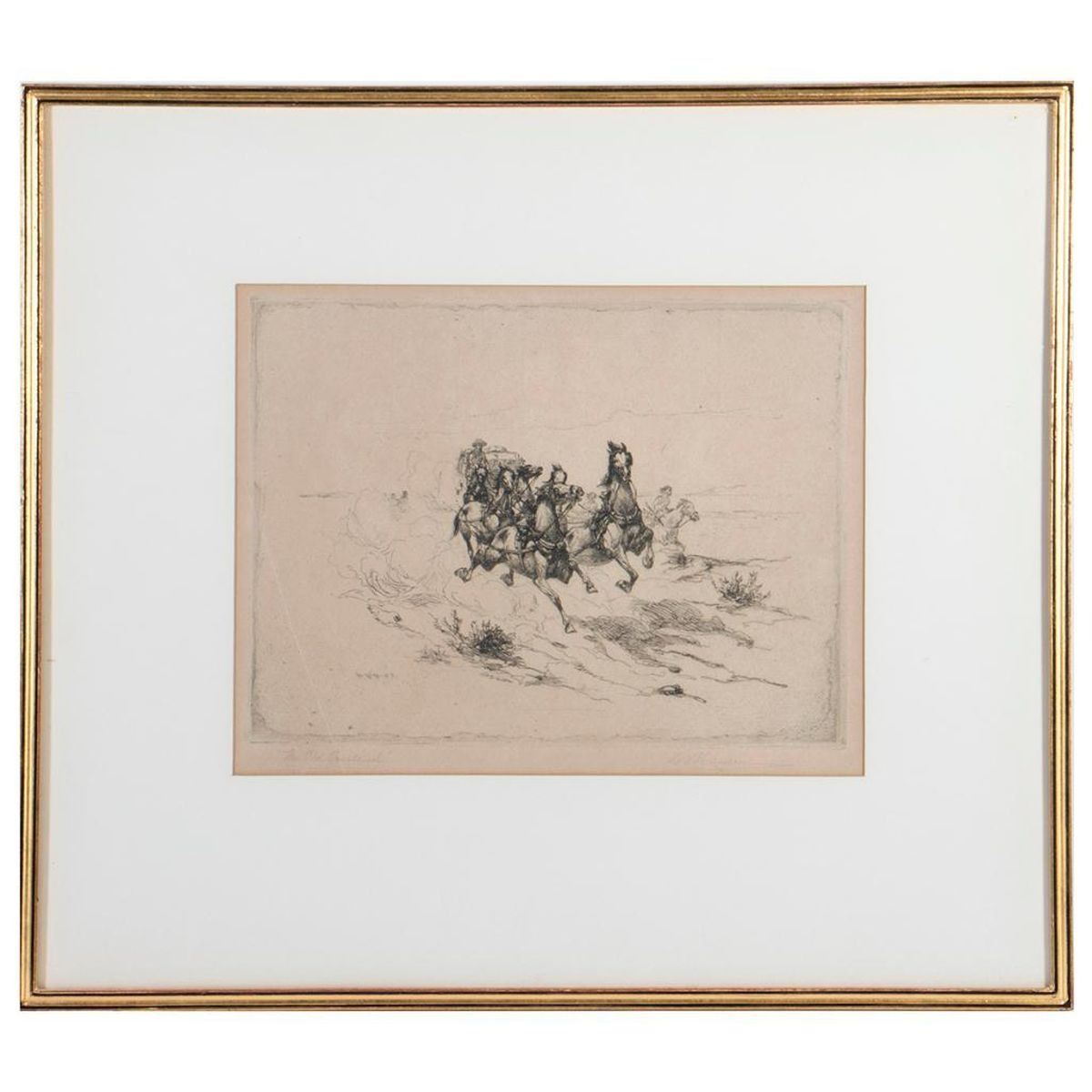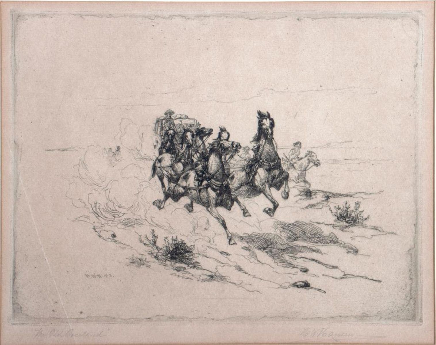 Artist: Herman Wendelborg Hansen (1854 - 1924). Title: The Old Overland. Signature: Lower left H.W.H (in plate) and lower right. Size: 7 1/2" x 10". Medium: Etching.