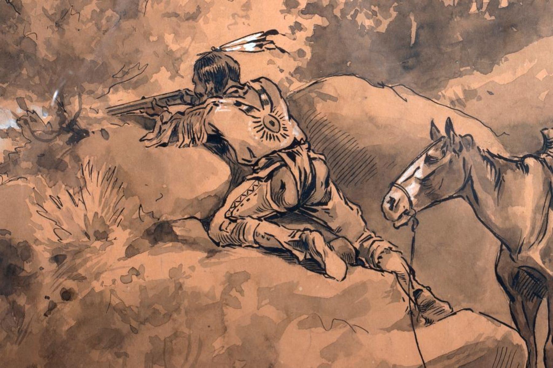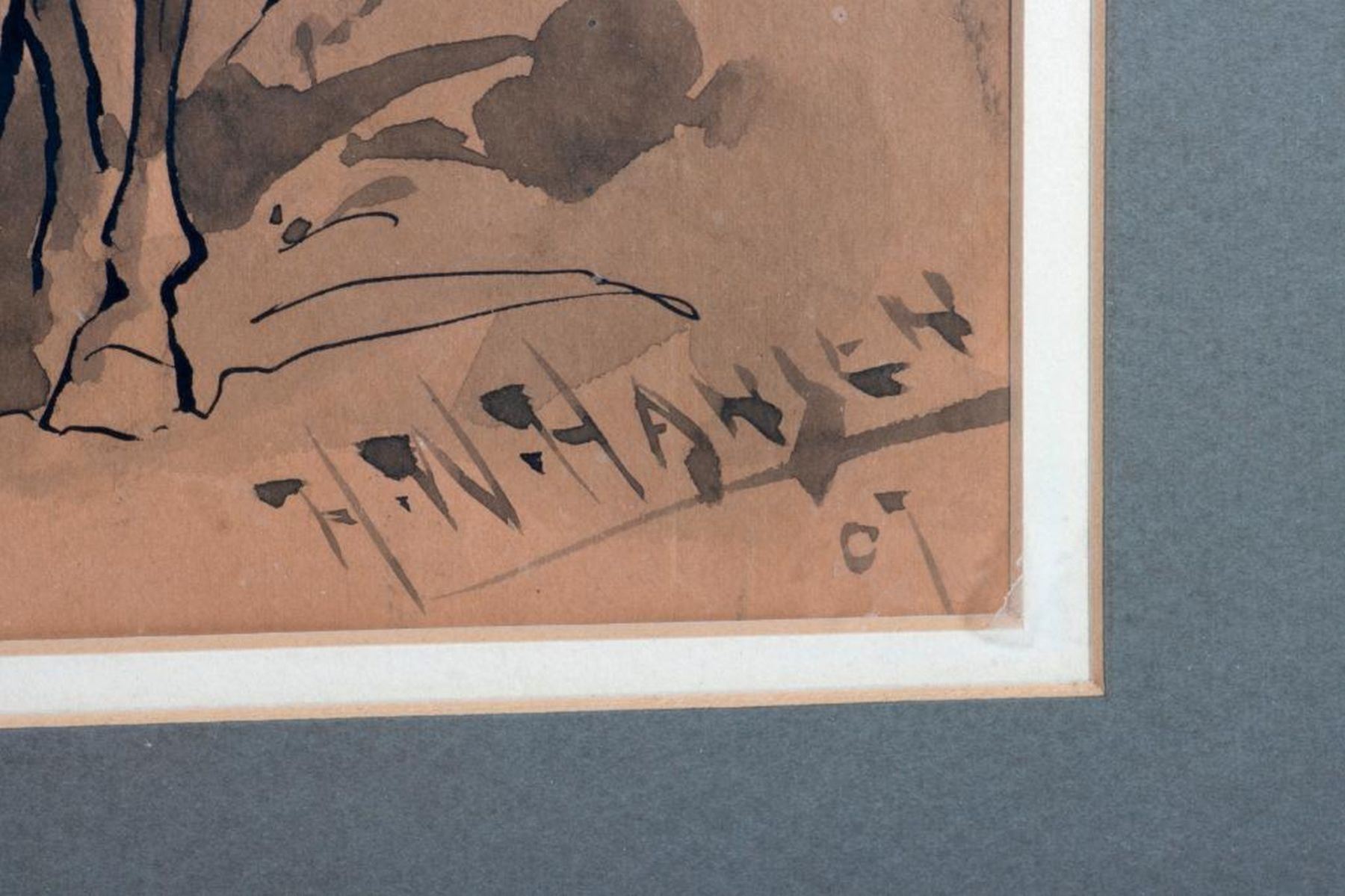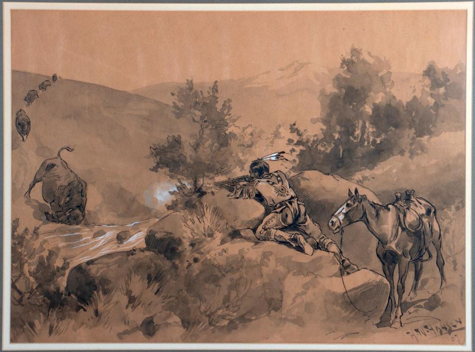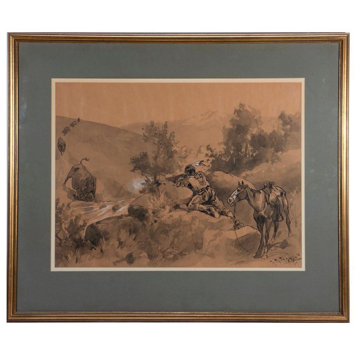 Artist: Herman Wendelborg Hansen (1854 - 1924). Title: Buffalo Hunt. Signature: Lower right. Size: 14.5" x 19". Medium: Ink and wash on paper.